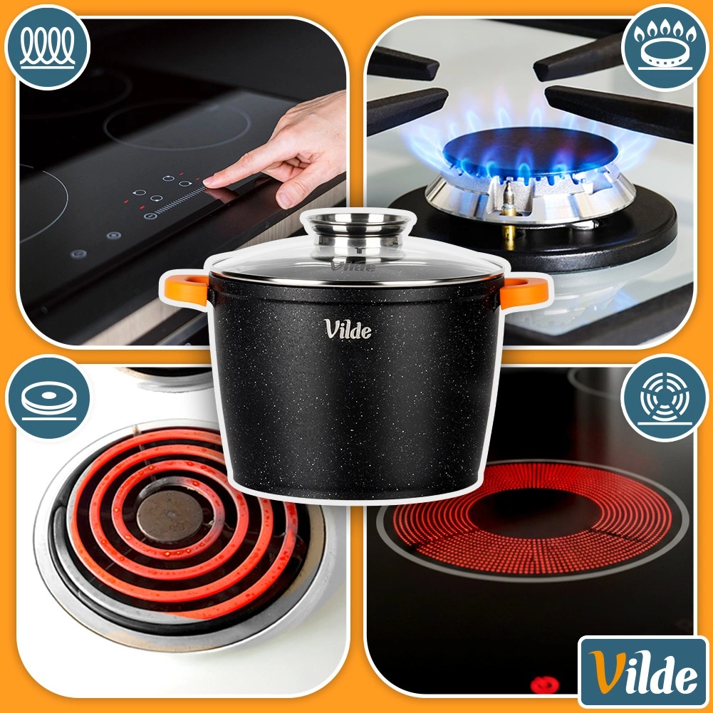 Fundul multistrat distribuie căldura uniform pe toată suprafața și este pe deplin compatibil cu plitele cu inducție pentru gătit rapid și economic.
