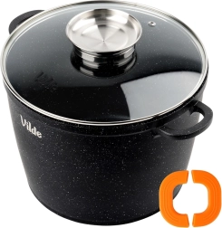 Oală robustă din aluminiu turnat cu acoperire antiaderentă din granit care permite gătitul cu minimum de grăsime, se curăță ușor și distribuie uniform căldura. Capacul din sticlă cu mâner din inox și dozator integrat pentru ingrediente lichide permite completarea cu apă, vin sau supă fără a ridica capacul.