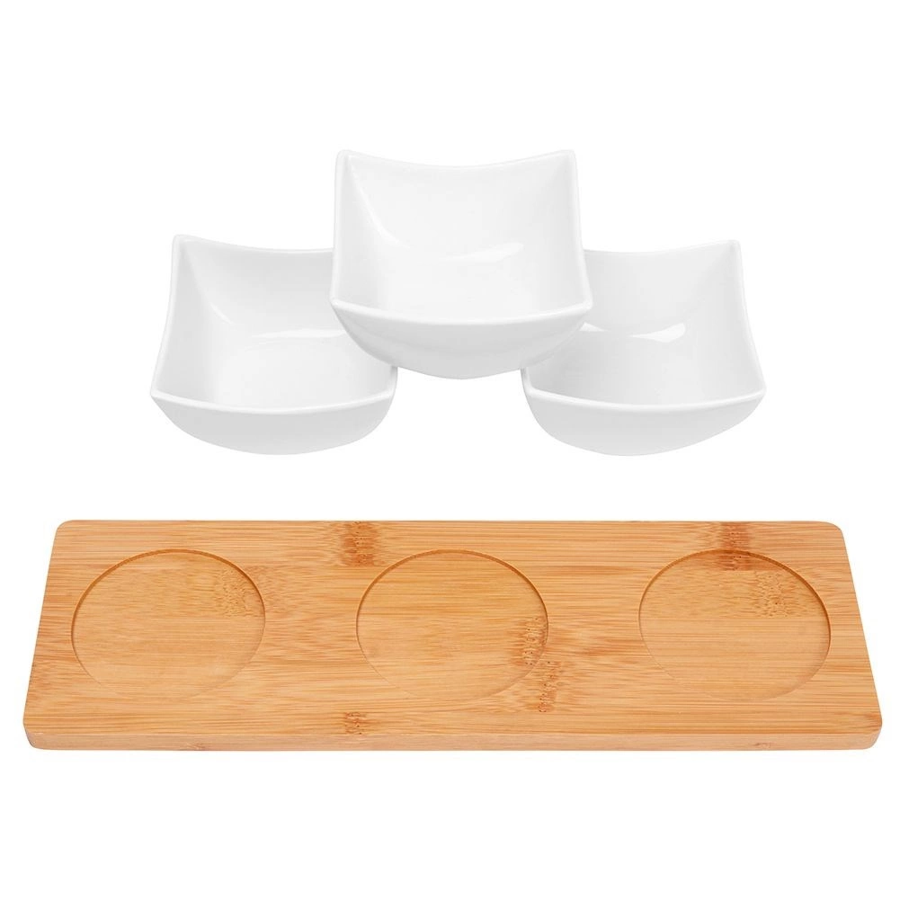 Acest set din 4 piese combină designul minimalist cu funcționalitatea. Trei boluri albe din porțelan sunt așezate pe o tavă solidă din bambus, cu locașuri frezate care previn alunecarea bolurilor la servire și transport. Perfect pentru mesele de acasă și pentru catering profesional.