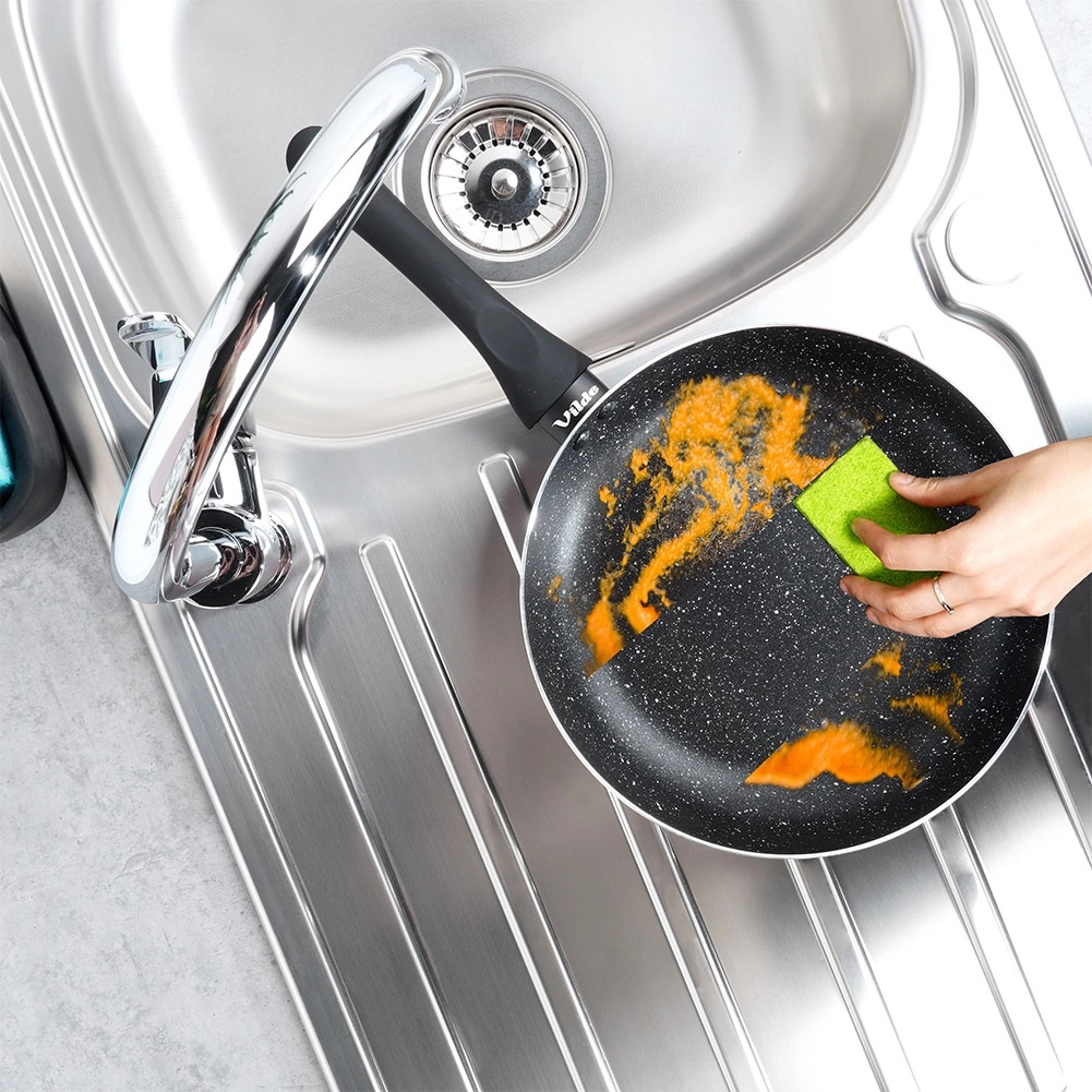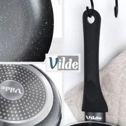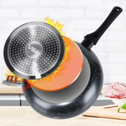 Fundul solid, cu distribuție uniformă a căldurii, este potrivit pentru gaz, electric, vitroceramic, halogen și inducție; tigăile pot fi spălate în mașina de spălat vase.