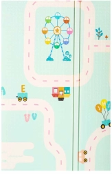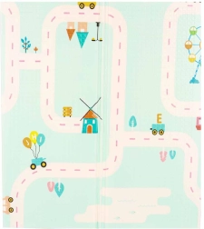 Pandale drăgălașe pe o parte și motiv cu drumuri pe cealaltă stimulează imaginația, învățarea și distracția cu mașinuțe și seturi de construcție.