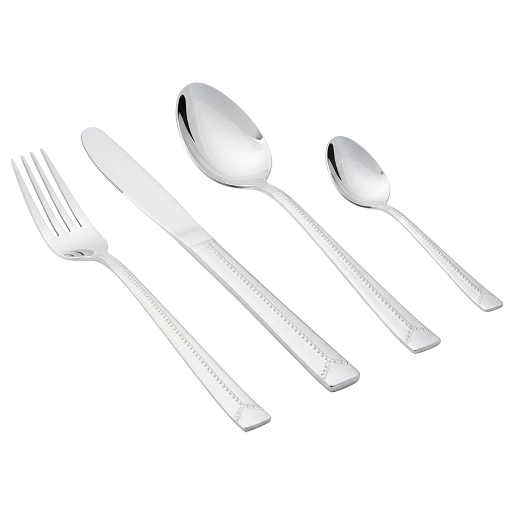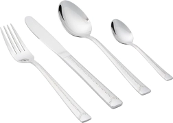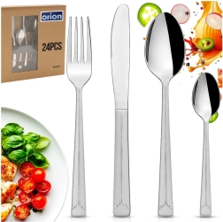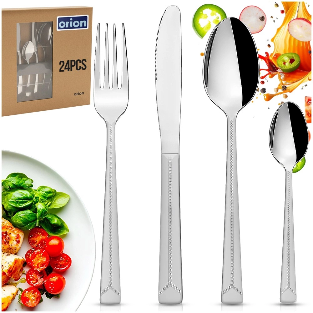 Set elegant de tacâmuri pentru 6 persoane, conține 24 de piese potrivite atât pentru uz zilnic, cât și pentru mese festive. Fabricat din oțel inoxidabil de calitate, cu suprafață rezistentă și design decorativ. Potrivit pentru mașina de spălat vase, totuși pentru strălucire de durată se recomandă spălarea manuală. Aspect clasic și atemporal care se potrivește oricărui serviciu de masă.
