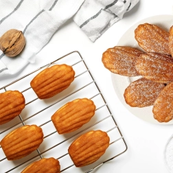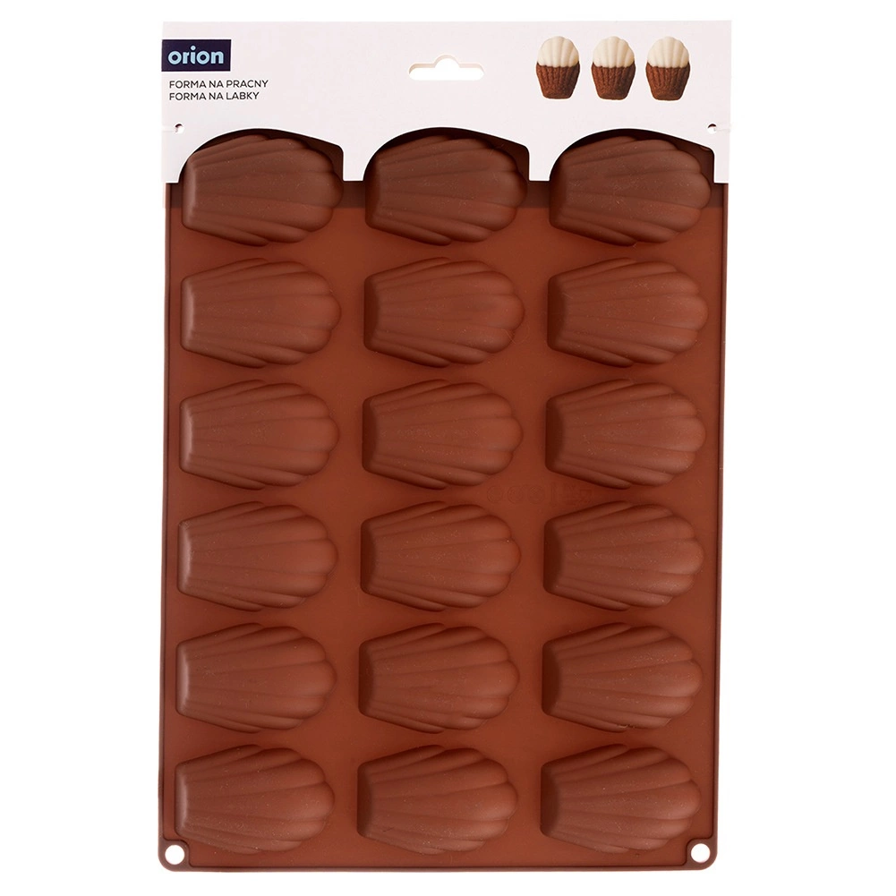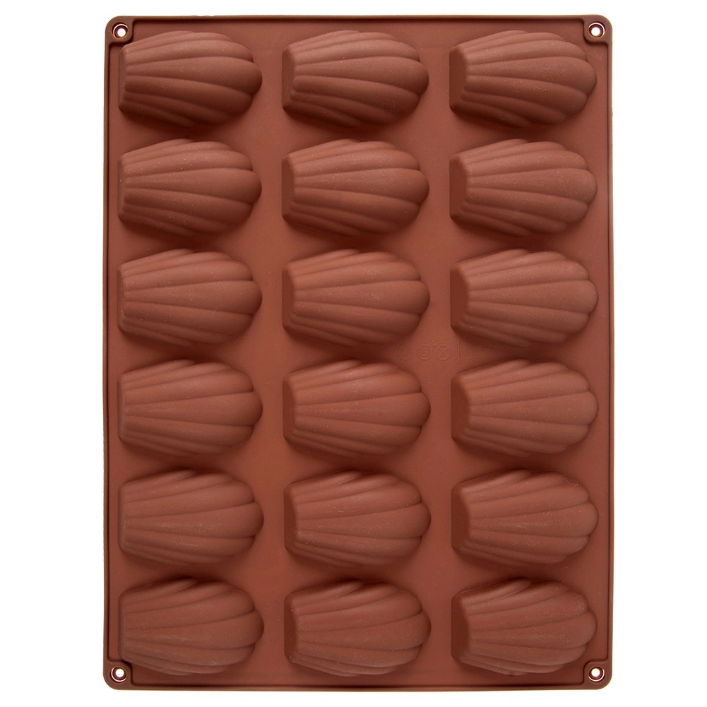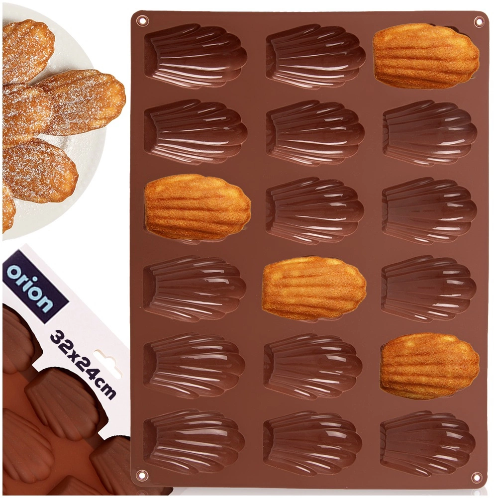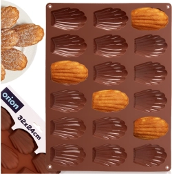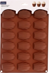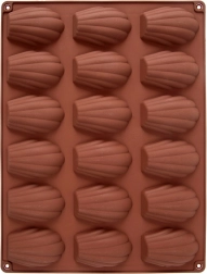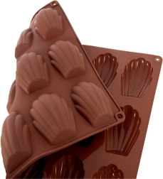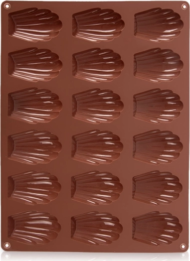 Această formă din silicon maro este ideală pentru coacerea madeleinelor, mini prăjituri sau pentru realizarea de praline și ciocolate în formă de scoică. Dimensiunile formei 32 × 24,5 × 2 cm includ 18 cavități, fiecare având aproximativ 7 × 4,5 cm. Nu absoarbe mirosuri sau arome, conduce foarte bine căldura și, datorită flexibilității, deserturile se scot ușor fără a fi nevoie de ungere.