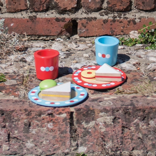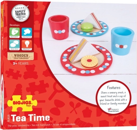 Acest set de ceai din lemn cu buline, plin de farmec, invită la un „ceai la ora cinci”. Copiii exersează servirea, politețea și împărtășirea, antrenând totodată prinderea și coordonarea mâinilor. Detaliile colorate și dimensiunile bine gândite îl transformă într-un accesoriu îndrăgit pentru orice bucătărie de jucărie.