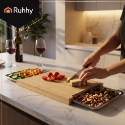 Tocătorul practic din bambus RUHHY, cu două tăvițe glisante din oțel inoxidabil, face pregătirea meselor mai plăcută. Oferă o suprafață de lucru mare, 40 × 28,5 cm, organizare rapidă a ingredientelor fără dezordine și bambus durabil și igienic. Recipientele sunt rezistente la temperatură, pot fi folosite în cuptor și spălate în mașina de spălat vase – ideale pentru gătit rapid acasă și în gastronomie.