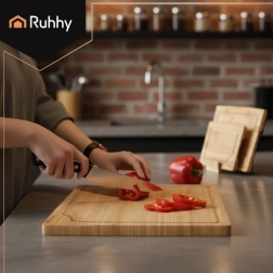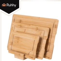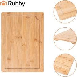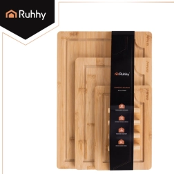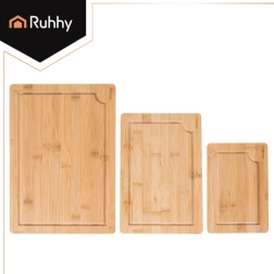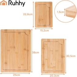 Set practic de trei tocătoare din bambus RUHHY, în dimensiuni diferite, cu suport solid pentru depozitare ordonată. Bambusul natural este rezistent și igienic, blând cu muchia cuțitelor și se usucă rapid. Canalele de scurgere pentru sucuri integrate ajută la menținerea curățeniei când tai carne, legume sau fructe. Ideal în orice bucătărie pentru tăiere și servire.