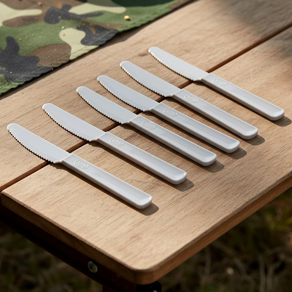 Cuțitele sunt perfecte pentru mesele în aer liber – de la petreceri în grădină la camping. Se împachetează ușor și, datorită execuției din plastic, sunt sigure și practice.