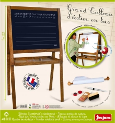 Descoperiți tabla universală pentru copii de la JEUJURA, ideală pentru scris, desen și primele exerciții școlare. Combină o tablă neagră liniată pentru cretă și o tablă albă magnetică pentru markere, are suport pentru rolă de hârtie și un raft spațios pentru accesorii. Structura reglabilă pe înălțime, din lemn masiv de fag și pin, este robustă și sigură. Pachetul include tot ce aveți nevoie pentru a crea imediat: creta, marker, burete, magneți și rolă de hârtie.
