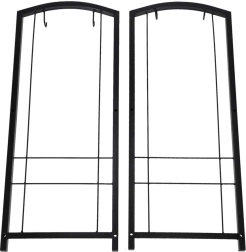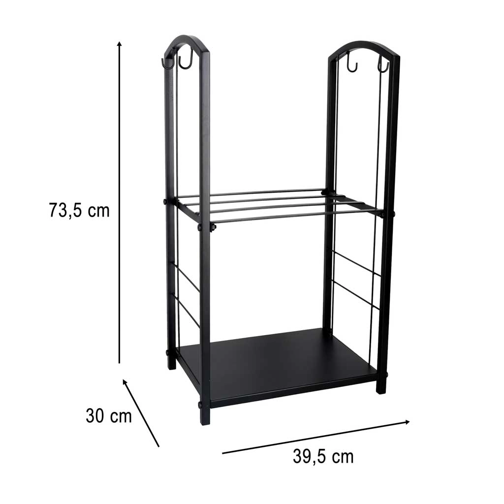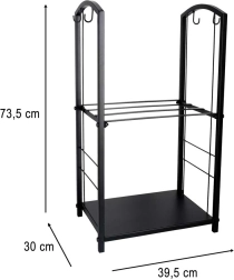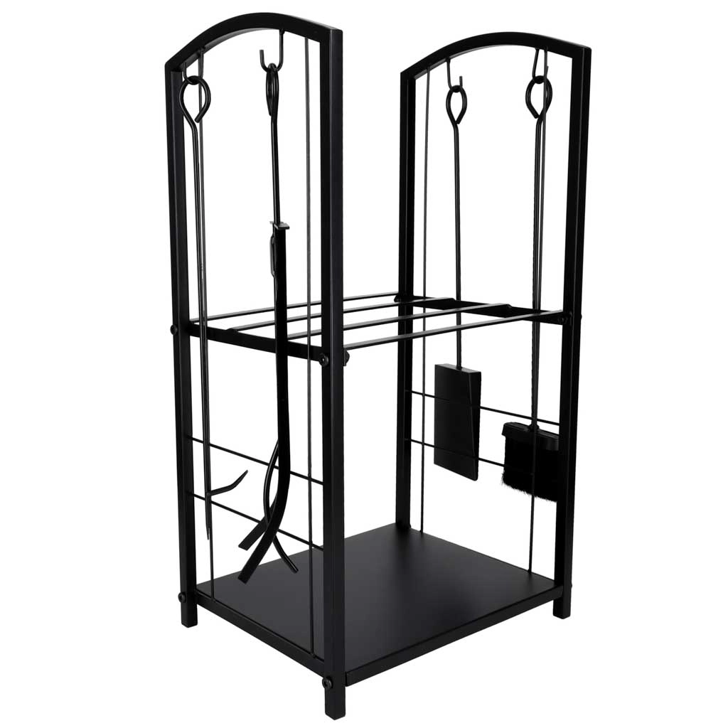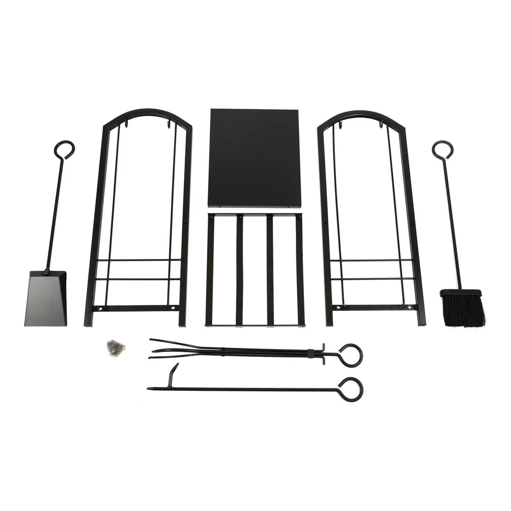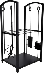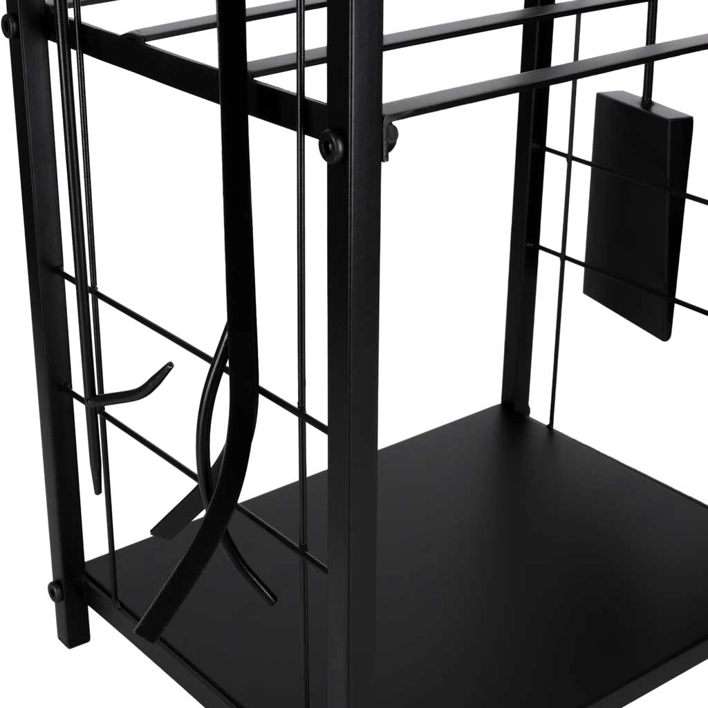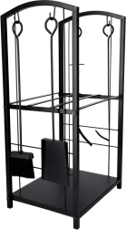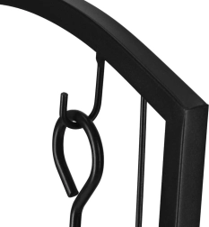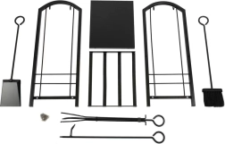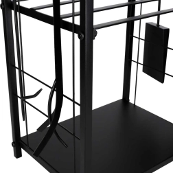 Pe cârligele laterale este agățat setul complet de unelte pentru șemineu – cârlig/șuflec, clește, lopățică și perie – astfel încât manevrarea focarului și curățarea cenușii sunt rapide și comode. Construcția deschisă cu laterale arcuite oferă un aspect ușor și elegant, potrivit atât interioarelor moderne, cât și celor rustice.