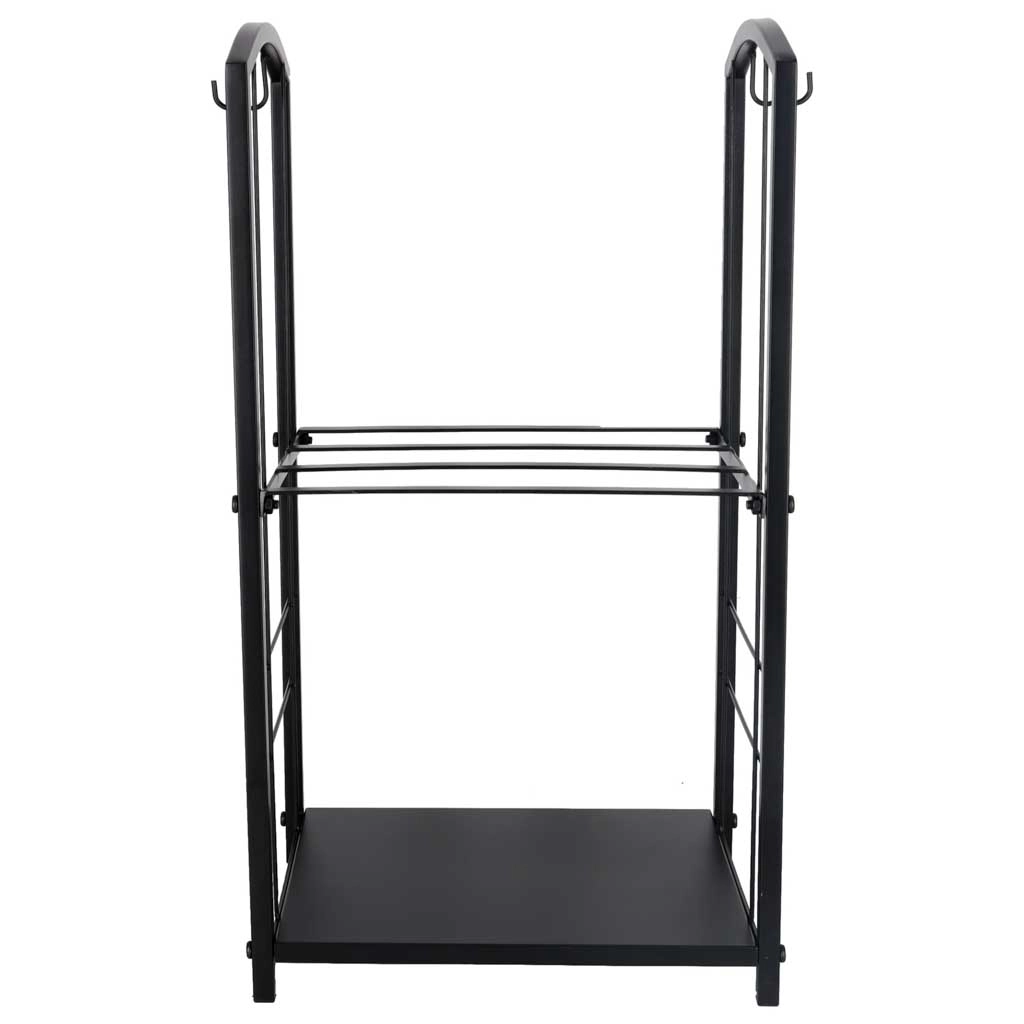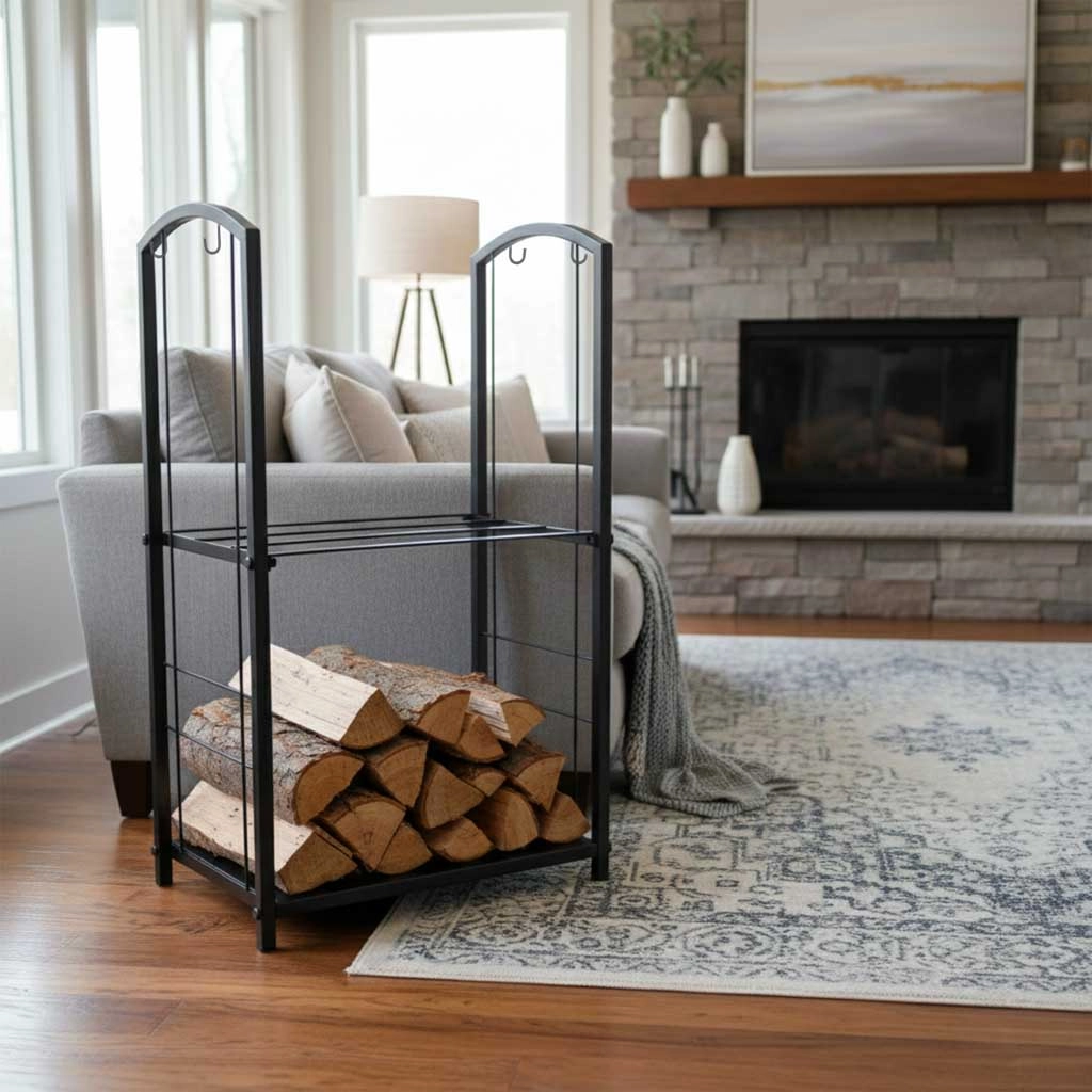 Acest suport compact transformă depozitarea lemnelor de foc într-un element de design al interiorului. Rama robustă din fier forjat, cu vopsea pulbere, este rezistentă la zgârieturi și face față utilizării zilnice. Raftul inferior plin protejează podeaua de murdărie, iar suprafața superioară ventilată menține buștenii uscați și ordonați.