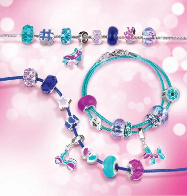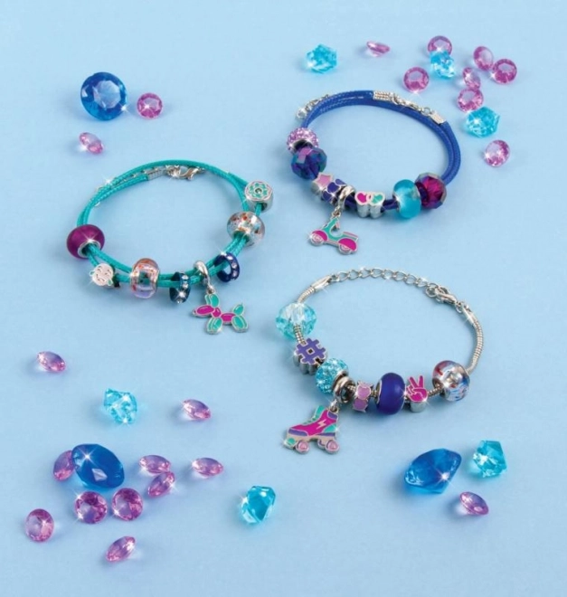 Setul conține material pentru realizarea a trei brățări stilate în tonuri de albastru–mov – ideal pentru a le împărți cu prietenele sau pentru a le purta în straturi.