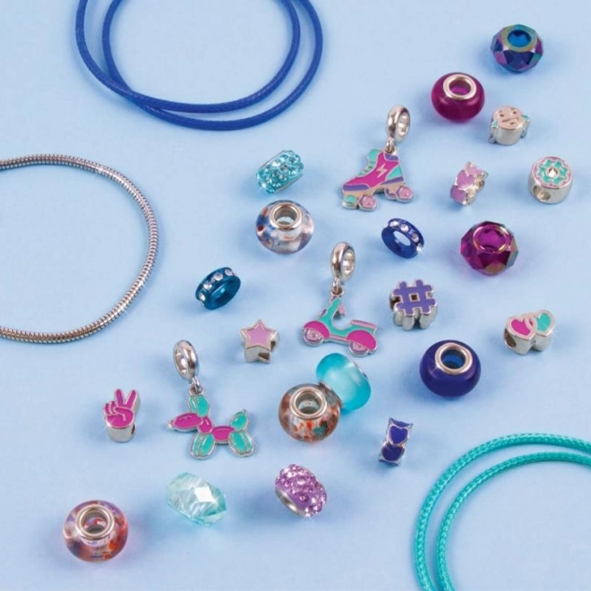 Un mix de mărgele argintii, albastre și mov este completat de pandantive jucăușe, cu care îți creezi un bijou unic, pe măsura ta.