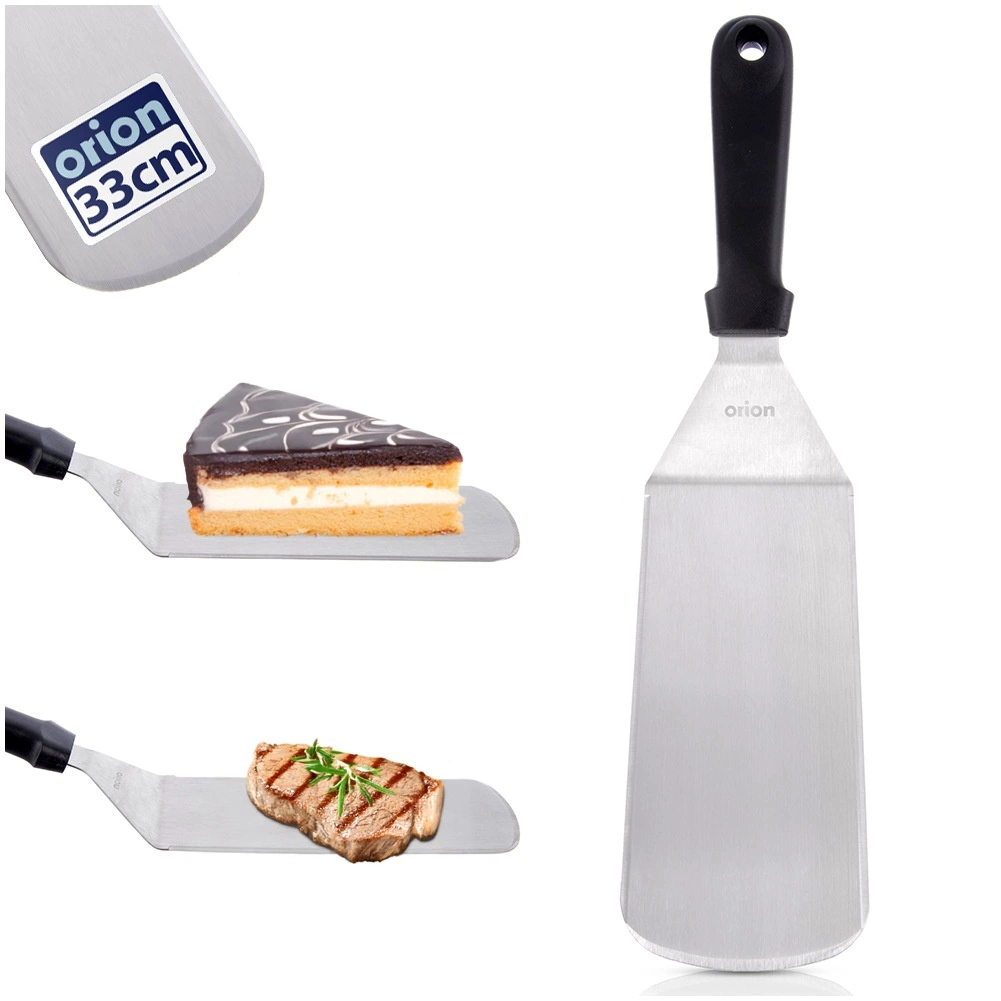 Paletă practică de bucătărie din oțel inoxidabil pentru ridicarea și întoarcerea ușoară a preparatelor. Are o lamă lată cu margini ascuțite pentru portionare și tăiere, mâner ergonomic pentru o prindere sigură și este potrivită pentru mașina de spălat vase. Ideală pentru pește, clătite, lasagna, turte, carne, pizza și omlete.