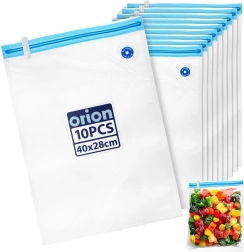 Setul de 10 pungi pentru vidare este ideal pentru depozitarea cărnii, legumelor, brânzeturilor, produselor de panificație și a mâncărurilor gătite. Datorită zipului dublu și valvei pentru evacuarea aerului creați un mediu etanș, care ajută la reducerea oxidării, deshidratării și arsurilor de congelare. O parte este netedă, cealaltă are textură pentru o evacuare uniformă a aerului.