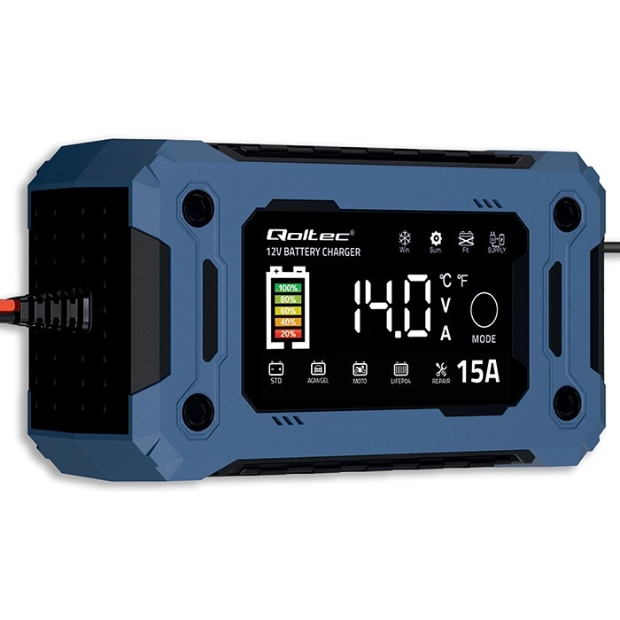 Prelungiți durata de viață a bateriei cu încărcătorul inteligent controlat de microprocesor. Recunoaște automat tipul de acumulator, adaptează curba de încărcare și, după încărcarea completă, trece în mod de întreținere, astfel încât nu există risc de supraîncărcare. Marele ecran LCD afișează tensiunea, curentul, starea încărcării și modul selectat, iar butonul tactil MODE simplifică operarea.