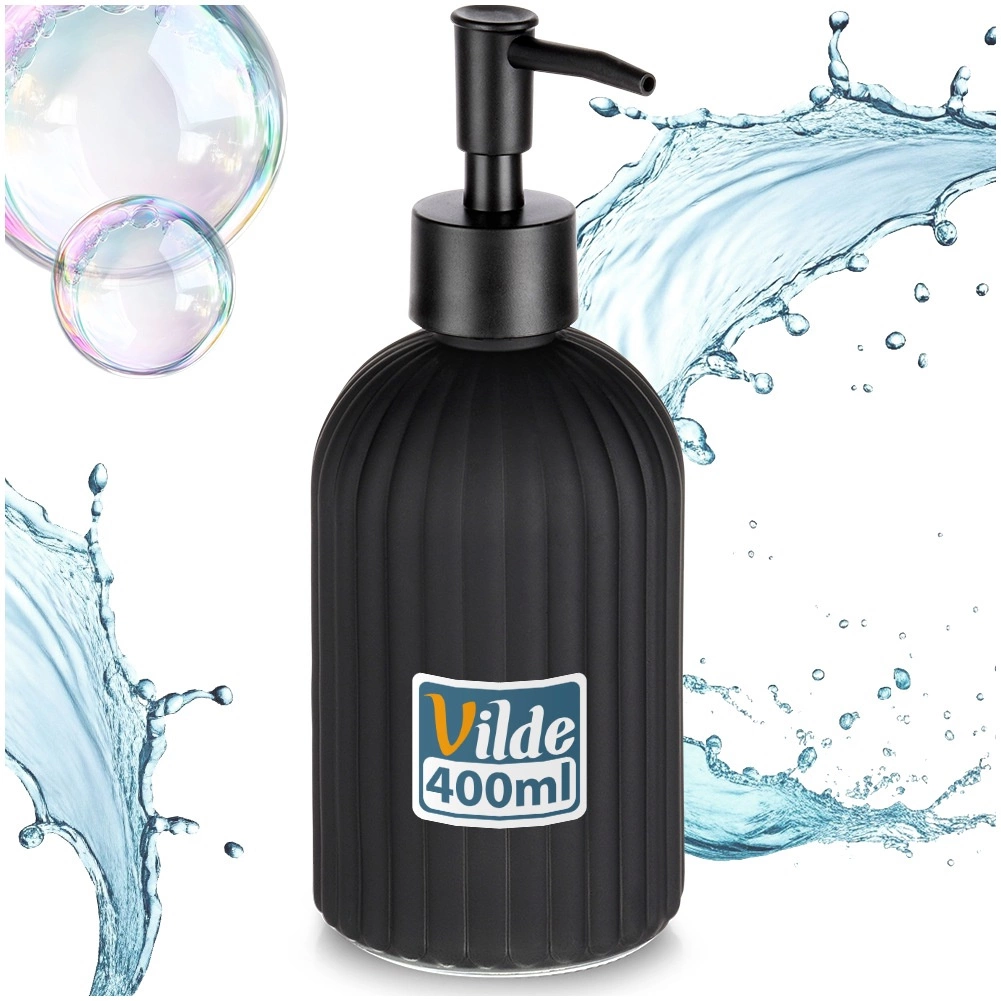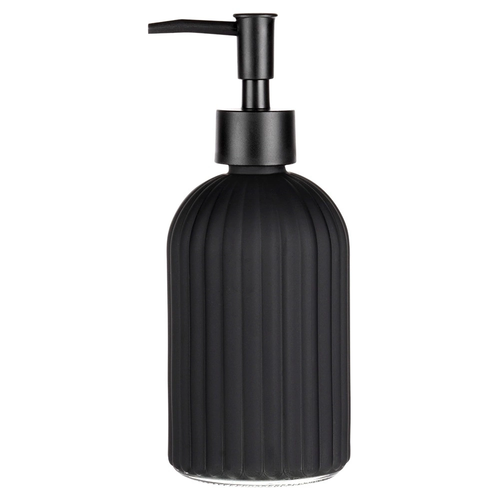 Elegant dozator din sticlă pentru săpun lichid sau detergent de vase cu volum de 400 ml, în culoare negru mat. Datorită suprafeței striate se potrivește perfect în mână, designul modern este potrivit atât pentru baie, cât și pentru bucătărie, iar realimentarea ușoară economisește timp și bani.