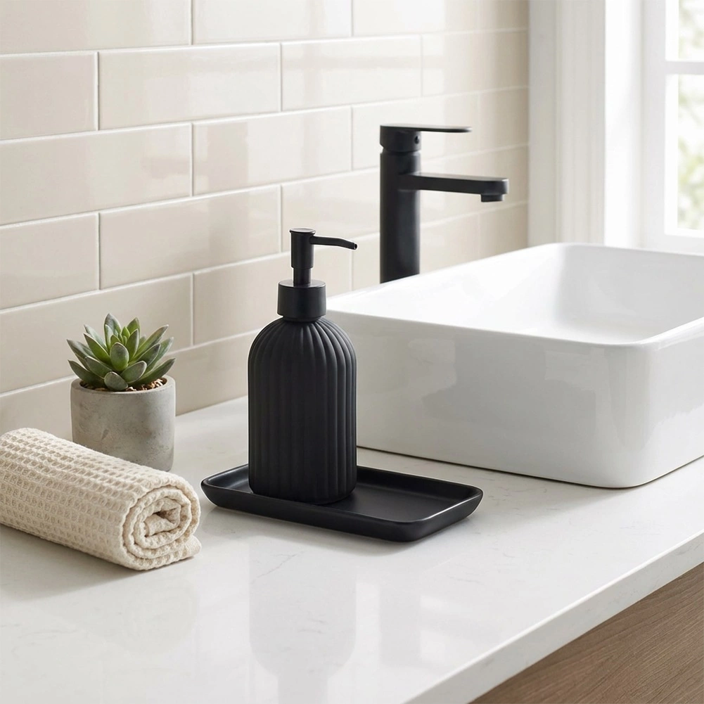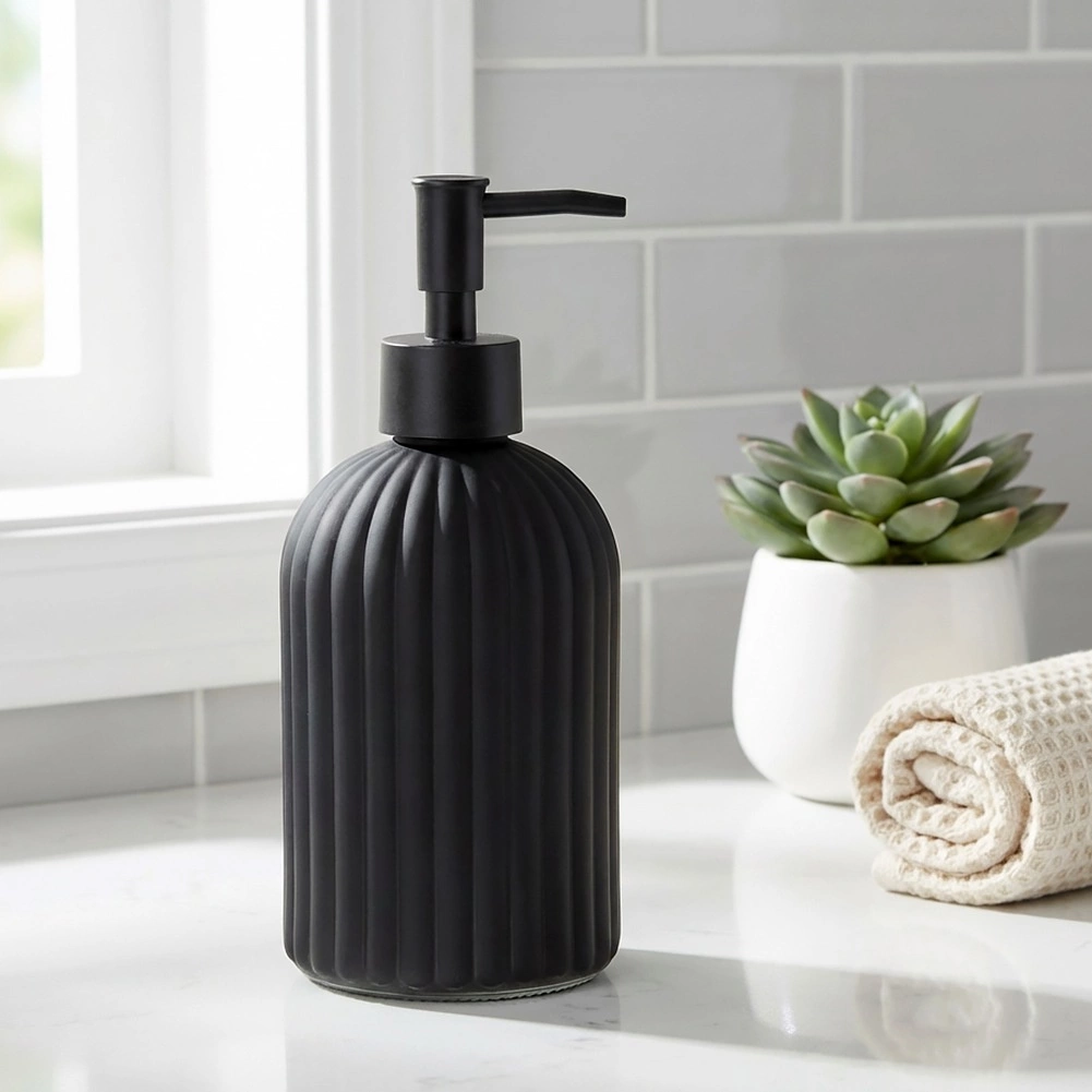 Dozatorul de săpun stilat din sticlă de calitate, în negru mat, este un accesoriu practic și decorativ pentru baia sau bucătăria dvs. Suprafața texturată, striată, oferă o prindere sigură și rezistență, în timp ce liniile curate subliniază aspectul modern al interiorului.