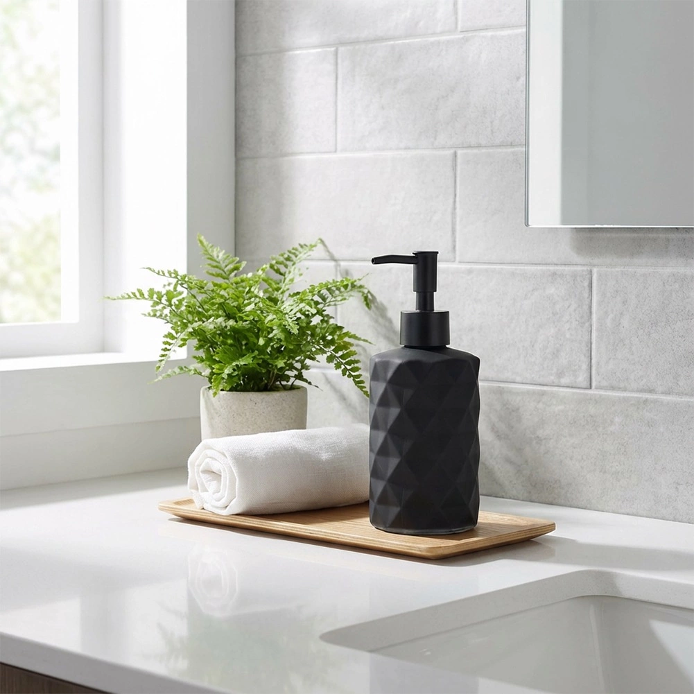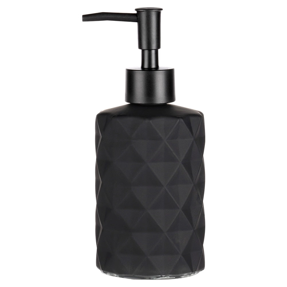 Dozator elegant pentru săpun lichid sau detergent de vase, cu volum de 330 ml, în finisaj negru mat. Datorită corpului din sticlă cu textură decorativă și designului modern, se potrivește perfect atât în baie, cât și în bucătărie. Reumplere comodă, pompiță practică și organizare stilată pe lavoar sau pe blat.