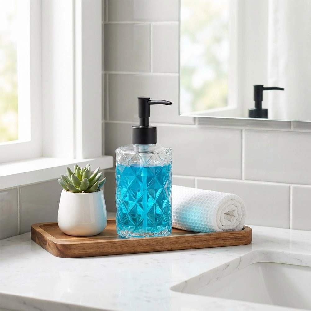Sticla clară cu model diamant este decorativă și practică – se ține mai bine în mână și reflectă frumos lumina pe lavoar sau pe blatul de bucătărie.