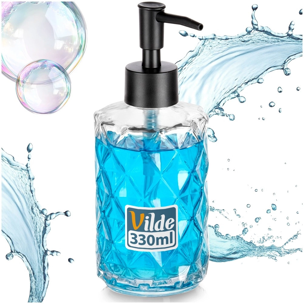 Dozator de săpun din sticlă, elegant, cu volum de 330 ml, dotat cu pompiță neagră și model decorativ în relief tip diamant, potrivit atât pentru baie, cât și pentru bucătărie. Sticla transparentă facilitează controlul cantității de conținut, reumplerea ușoară economisește timp, iar designul modern păstrează spațiul ordonat și elegant.
