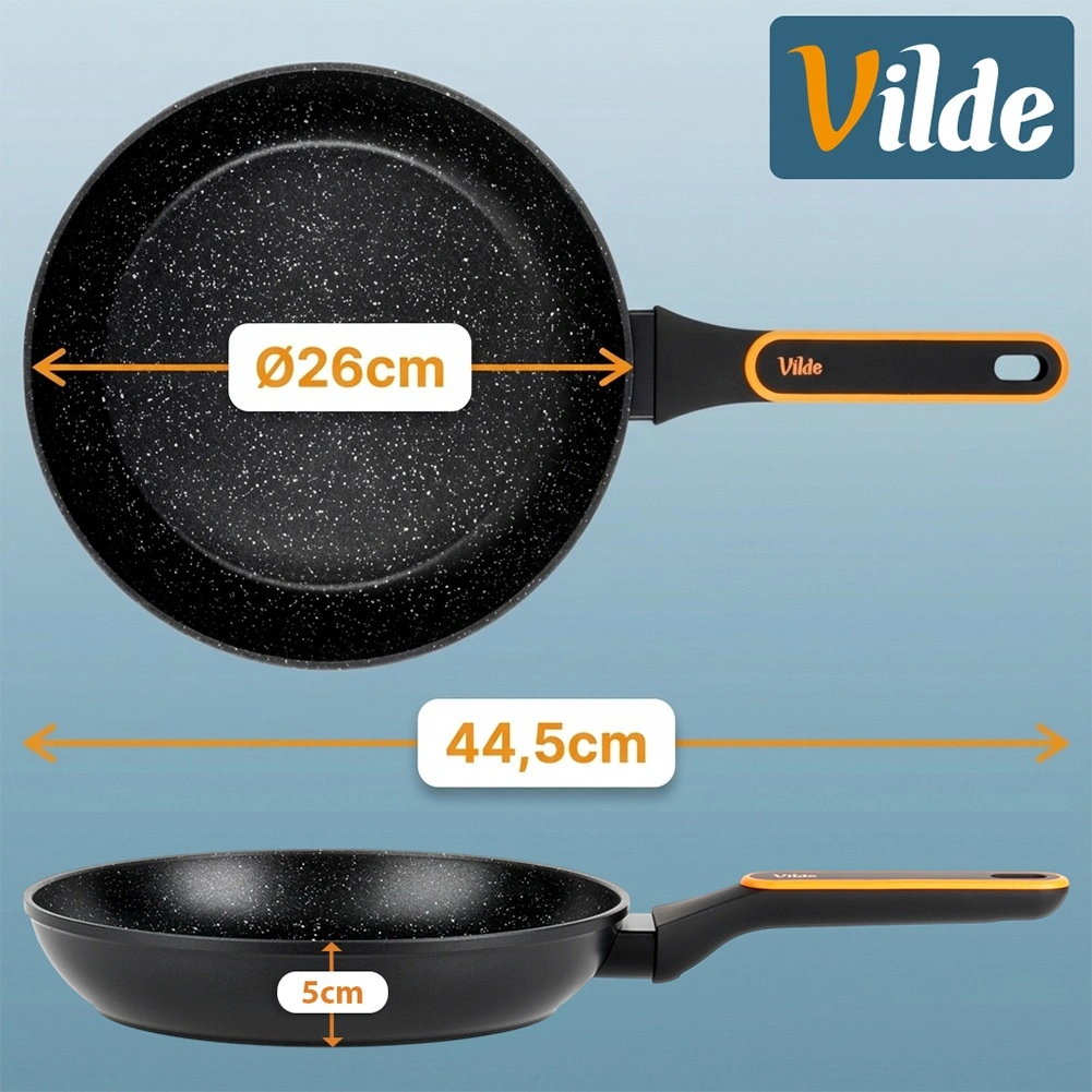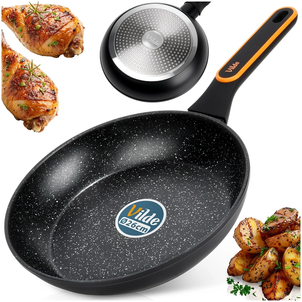 - Diametru 26 cm – dimensiune perfectă pentru ouă, carne, legume și cine rapide.