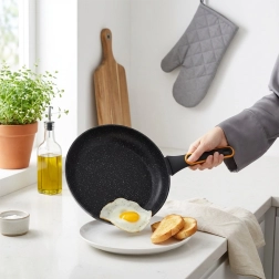 Descoperiți tigaia durabilă din linia TERRUNA, care îmbină designul modern cu funcționalitatea de primă clasă. Stratul antiaderent din granit permite gătirea cu minimum de ulei, se curăță ușor și este ideal atât pentru prăjire, cât și pentru înăbușirea cărnii, legumelor sau ouălor.