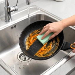 Suprafața cu efect de piatră previne lipirea și permite gătirea cu minimum de grăsime, iar curățarea se face într-o clipă.