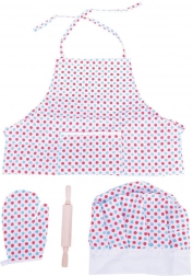 Oferiți micilor bucătari tot ce au nevoie pentru primele încercări de copt și pentru un joc de gătit distractiv. Șorțul textil ușor, cu buline protejează hainele, boneta de bucătar se ajustează ușor datorită ariciului, iar sucitorul din lemn împreună cu formele de tăiat din metal stimulează creativitatea și bucuria de a crea.