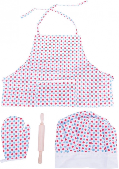 Un set de bucătar pentru copii, stilat, cu șorț cu buline de la Bigjigs Toys va însufleți orice joc de gătit. Conține șorț cu buline, bonetă de bucătar cu arici, mănușă, sucitor din lemn și forme de tăiat din metal – ideal atât pentru joc de rol, cât și pentru copt asistat.