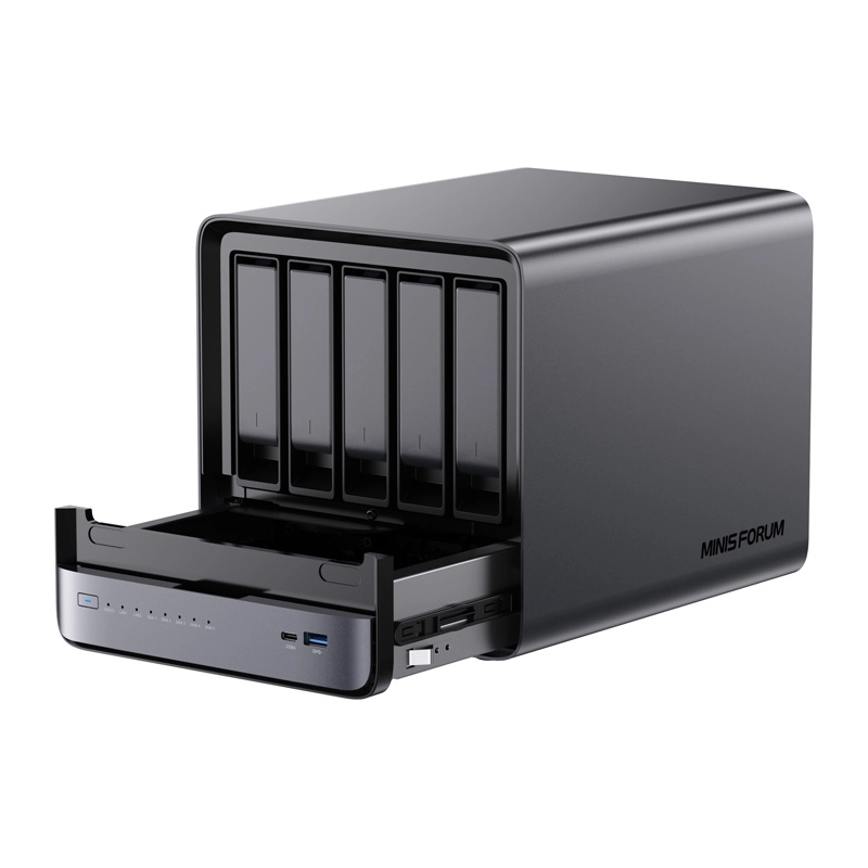 Mini PC/NAS-ul compact MINISFORUM N5 Pro combină performanța AMD Ryzen AI 9 HX Pro 370, accelerare AI locală de până la 50 TOPS, rețea rapidă 10 GbE și stocare de până la 144 TB. Datorită DDR5 ECC, suportului RAID și conectivității bogate (inclusiv PCIe x16 și OCuLink) este ideal pentru dezvoltatori, creatori și companii care au nevoie de un server și stație de lucru fiabilă, silențioasă și scalabilă într-un singur dispozitiv.