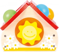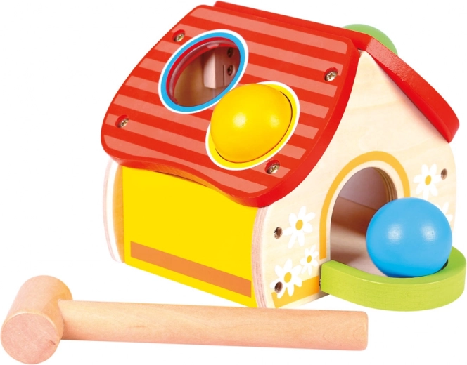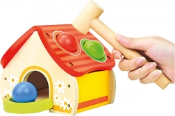 Această jucărie din lemn de calitate, sub forma unei căsuțe vesele, îi atrage pe copii prin culorile vii și principiul simplu al jocului – mingile se introduc în orificiile de pe acoperiș și se bat ușor cu ciocănelul. Distracția sprijină dezvoltarea motricității, răbdarea și precizia.
