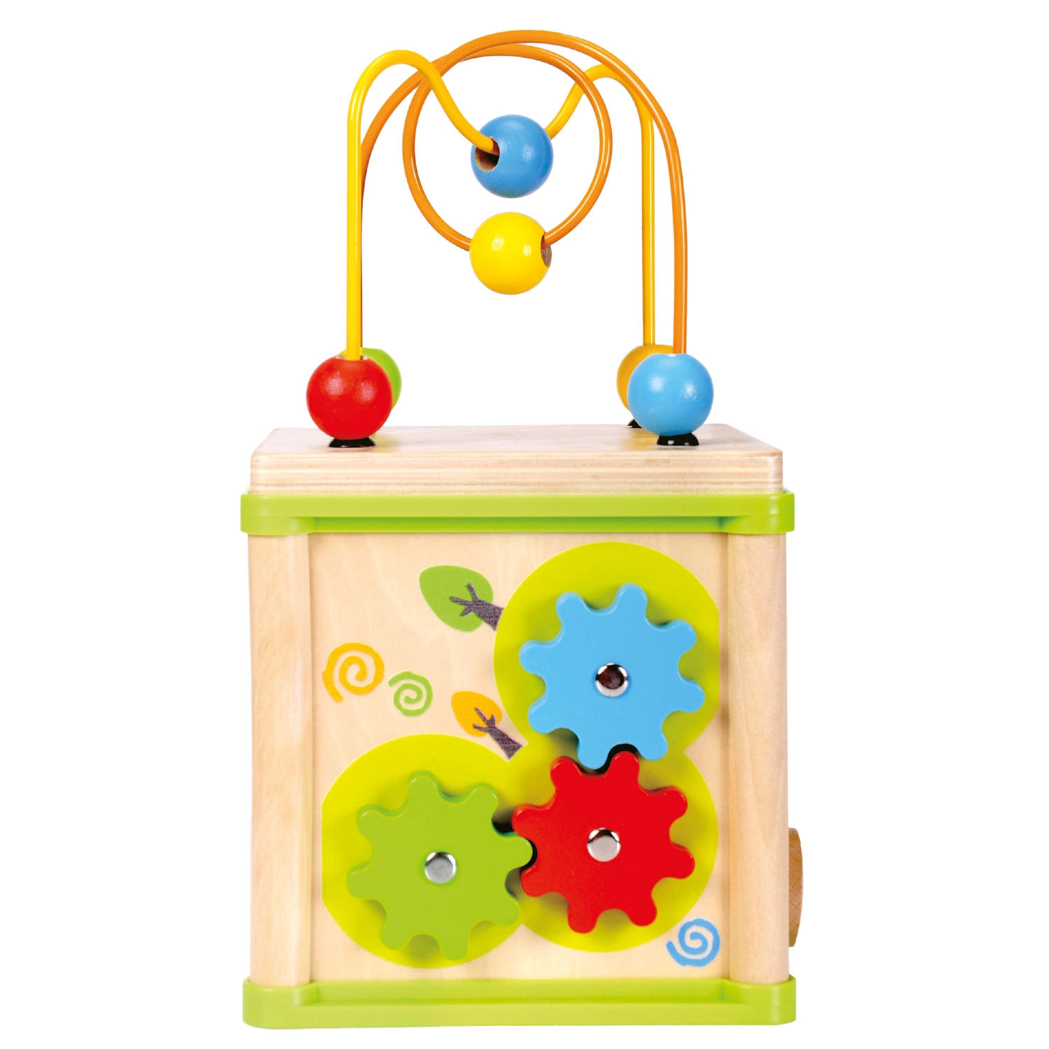 Acest cub activ versatil din lemn combină cinci elemente de joc atractive într-un format compact. Copiii pot asocia animalele cu hrana lor, pot ghida mărgelele pe trasee șerpuite, pot explora funcția rotițelor dințate sau pot exersa sortatorul de forme. Partea superioară este un labirint cu mărgele, care susține coordonarea mână–ochi și concentrarea.