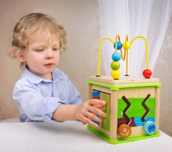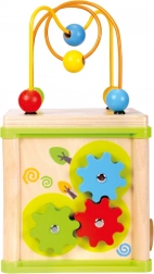 Acest cub motric multifuncțional îmbină cinci activități îndrăgite: sortator de forme, angrenaje cu roți dințate, trasee șerpuite cu piese glisante, asocierea animalelor cu hrana lor și labirintul cu mărgele de pe partea superioară. Fiecare latură a cubului este concepută pentru a stimula coordonarea mână–ochi, răbdarea și concentrarea.