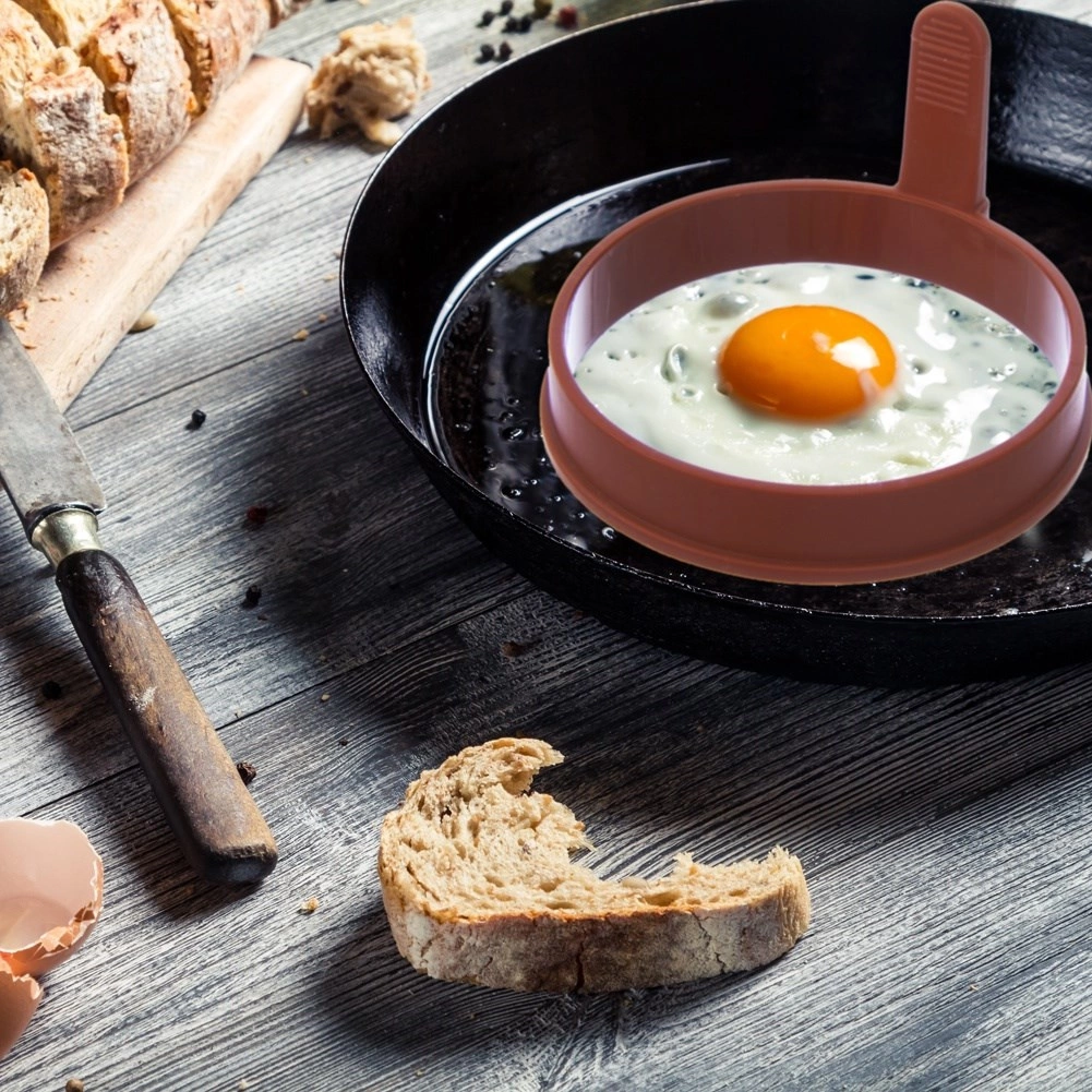 Această formă din silicon permite pregătirea de ouă ochiuri perfect rotunde, fără ardere și fără a fi nevoie de grăsime. Datorită suprafeței antiaderente, ouăle și aluatul se desprind ușor, iar forma nu absoarbe mirosuri sau arome. Dimensiunea compactă economisește spațiu în bucătărie, iar mânerul comod facilitează manipularea fără risc de opărire.