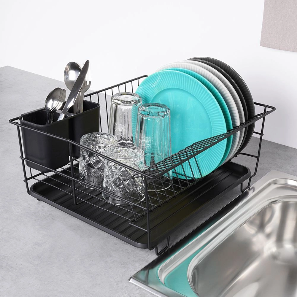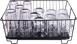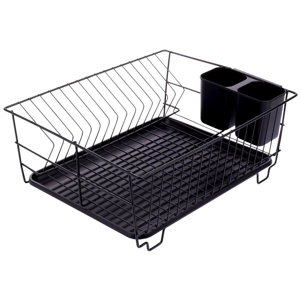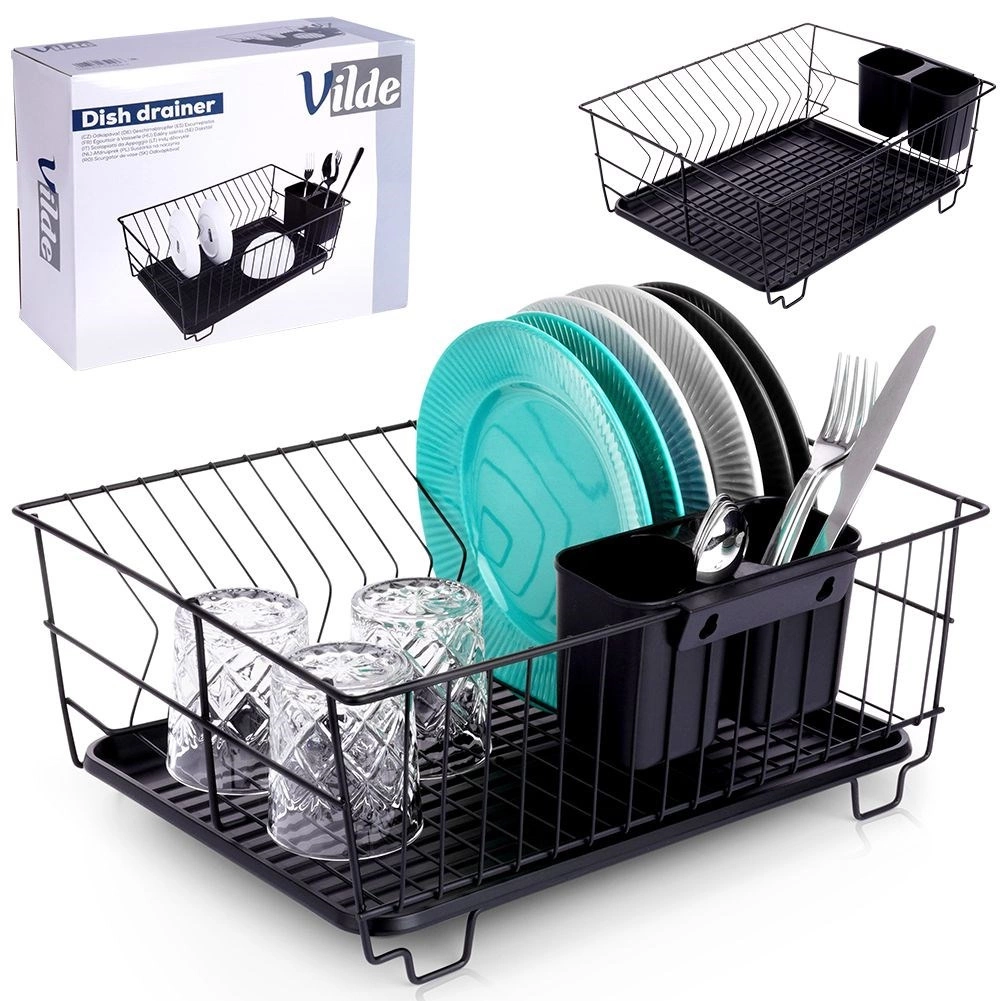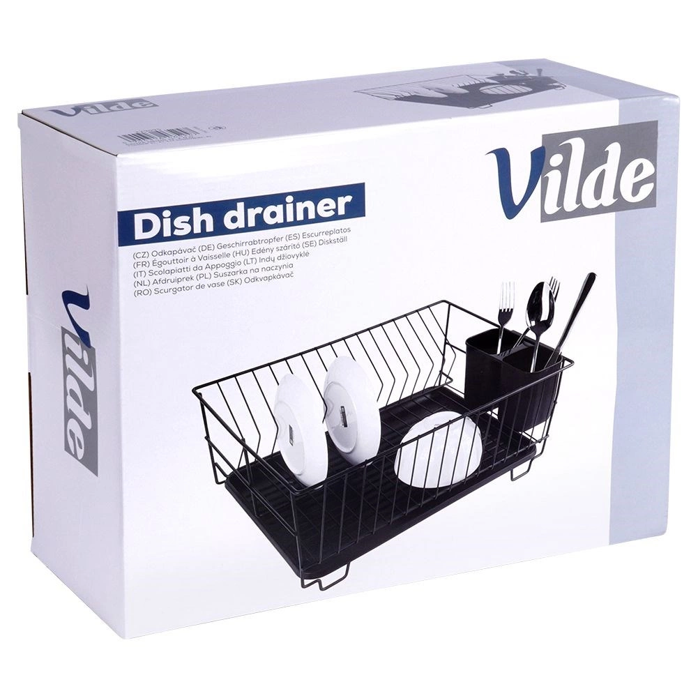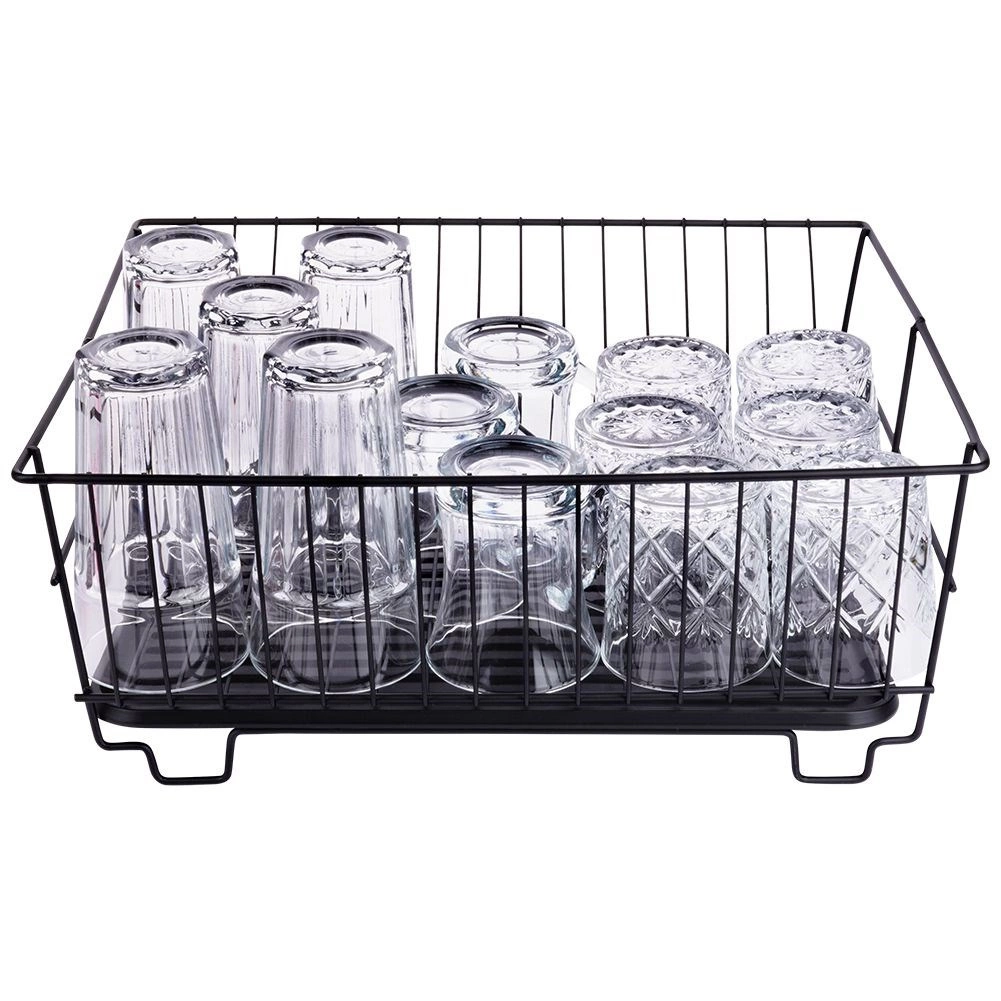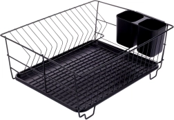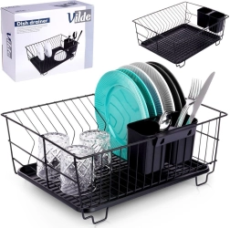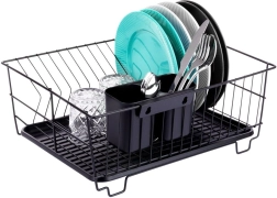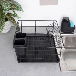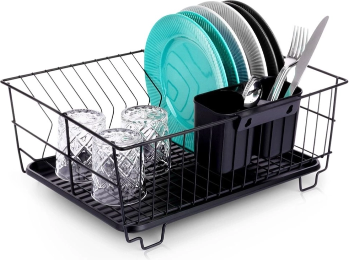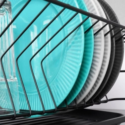 Scurgător de vase stilat și funcțional, din metal rezistent, în culoare negru mat, îmbină designul loft modern cu practicitatea de zi cu zi. Oferă sloturi dedicate pentru până la 15 farfurii și suficient spațiu pentru pahare, boluri și piese de veselă mai mari. Tava de scurgere din plastic, detașabilă colectează apa și menține blatul uscat.