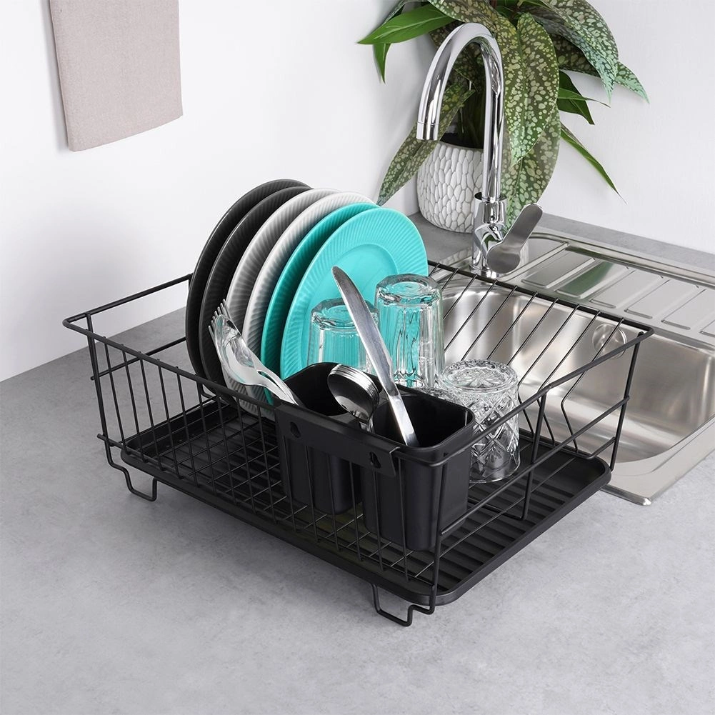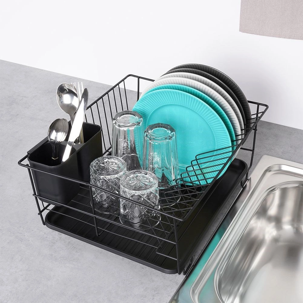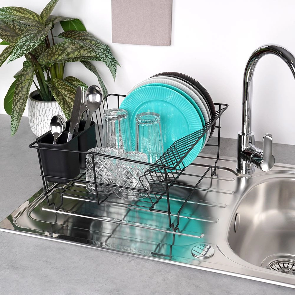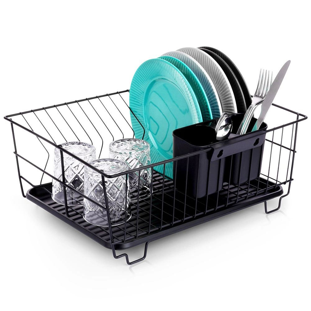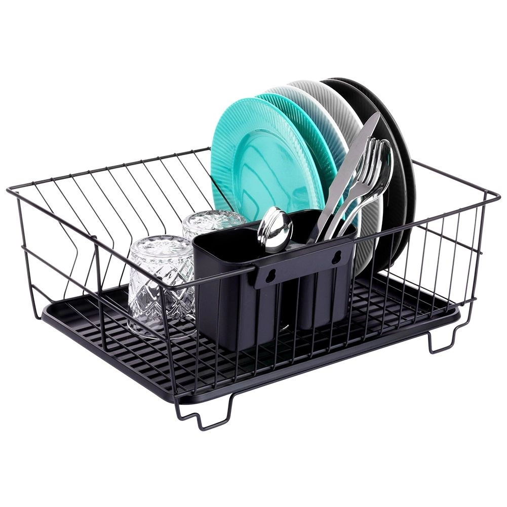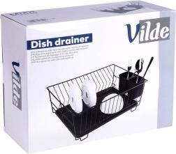 Scurgător de vase stilat și funcțional, din metal rezistent, în culoare negru mat, îmbină designul loft modern cu practicitatea de zi cu zi. Oferă sloturi dedicate pentru până la 15 farfurii și suficient spațiu pentru pahare, boluri și piese de veselă mai mari. Tava de scurgere din plastic, detașabilă colectează apa și menține blatul uscat.
