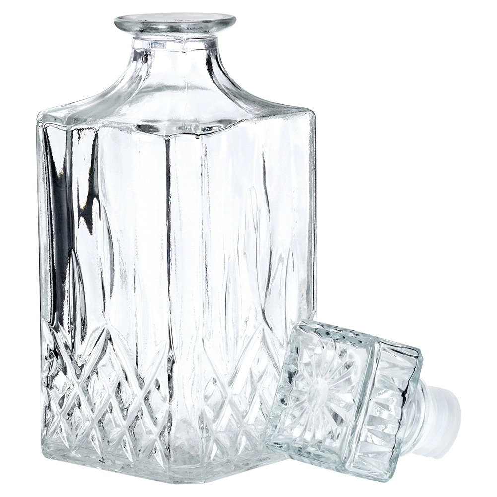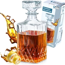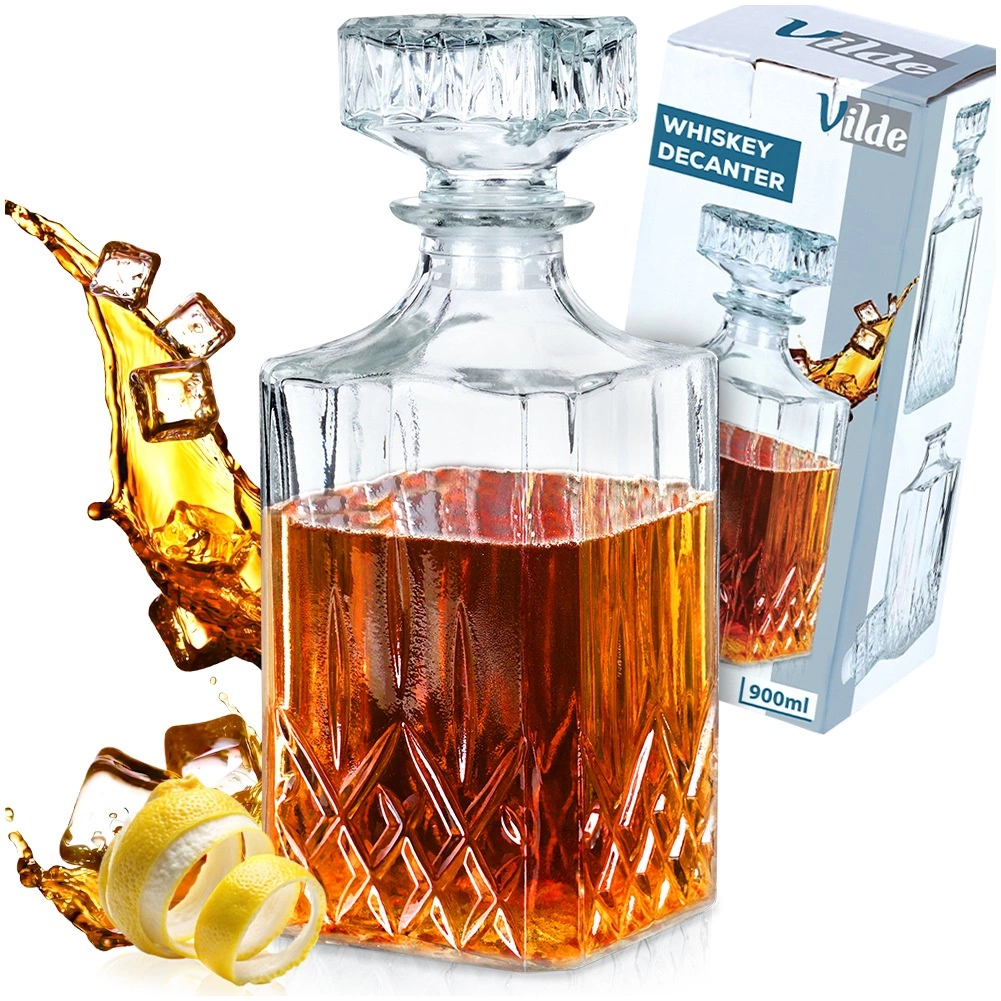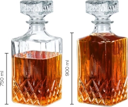Carafă elegantă din sticlă cu dop de plută, în formă modernă pătrată, ideală pentru servirea whisky-ului și a altor băuturi. Oferă un volum maxim de 900 ml și un volum util confortabil de 750 ml pentru o manevrare ușoară. Fabricată din sticlă transparentă rezistentă, potrivită pentru mașina de spălat vase și păstrează excelent aroma și gustul datorită etanșării ferme. Designul stilat oferă mesei tale un aspect decorativ și este, de asemenea, un cadou grozav pentru iubitorii de distilate de calitate.