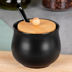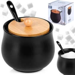 Elegantă zahărniță neagră din ceramică, cu capac din bambus și linguriță practică, ideală pentru servirea zilnică. Oferă capacitate de 250 ml, dozare ușoară datorită decupajului din capac și design modern minimalist, care se potrivește perfect în orice bucătărie sau cafenea.