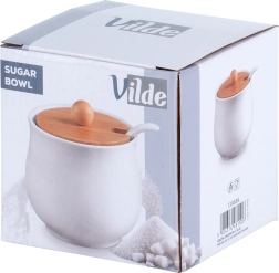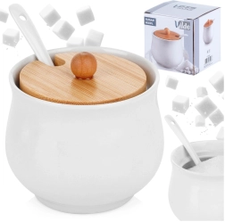 Zaharniță elegantă, albă, cu capac din bambus și linguriță ceramică, ideală pentru servirea de zi cu zi. Oferă capacitate de 250 ml, capac detașabil cu decupaj pentru linguriță și execuție ceramică durabilă, care menține conținutul proaspăt și curat mai mult timp.