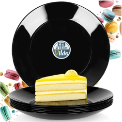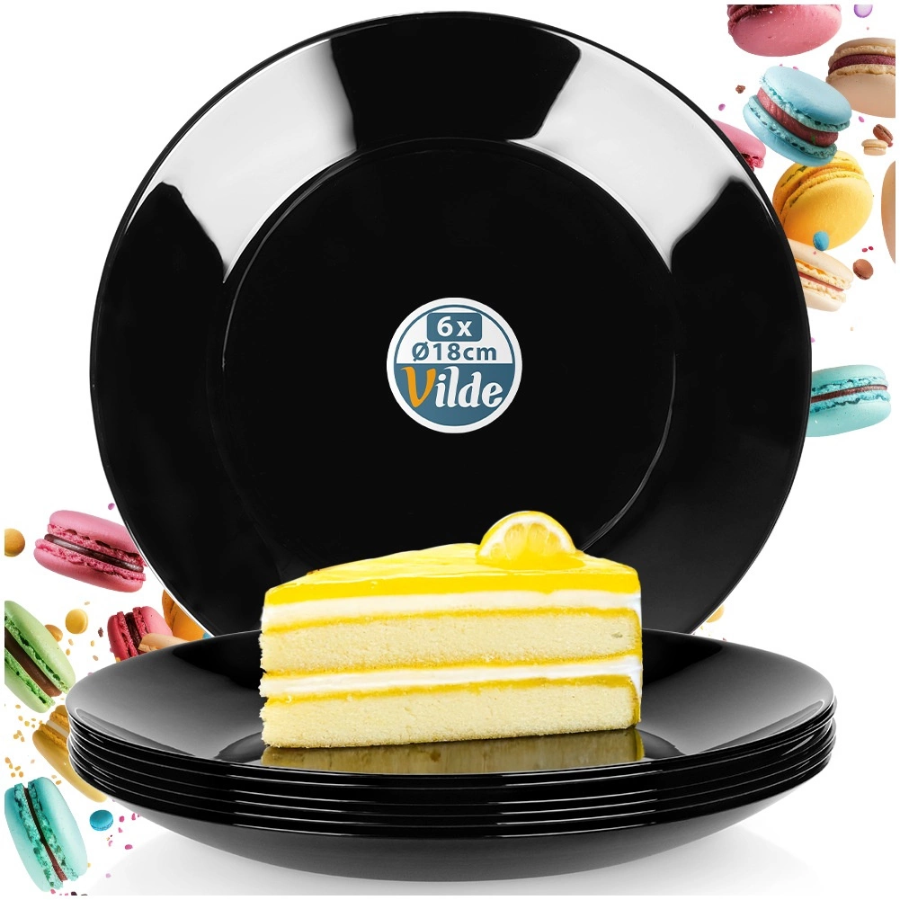Set elegant de 6 farfurii de desert negre din sticlă opal rezistentă, ideal pentru mesele zilnice și ocazii festive. Farfuriile cu diametrul de 18 cm sunt compatibile cu mașina de spălat vase și cuptorul cu microunde, rezistă la temperaturi de până la +100 °C și, datorită designului clasic, se combină ușor cu alte piese. Produs original marca VILDE.