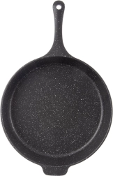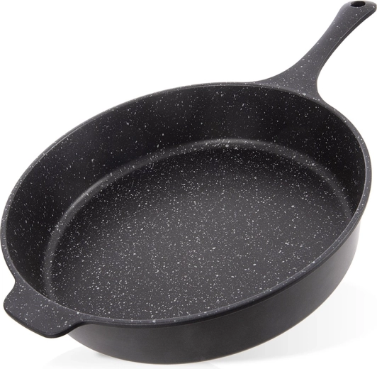 Tigaie adâncă GRANDE cu diametrul de 28 cm și volum de 3 l, din aluminiu turnat, pentru gătit zilnic. Are suprafață antiaderentă tip granit Pfluon Granit, fără PFOA și PTFE, este potrivită pentru toate tipurile de plite, inclusiv inducție, precum și pentru cuptor și mașină de spălat vase. Construcția robustă, monobloc, cu mâner confortabil asigură distribuție uniformă a căldurii și prăjire și înăbușire rapide și economice.