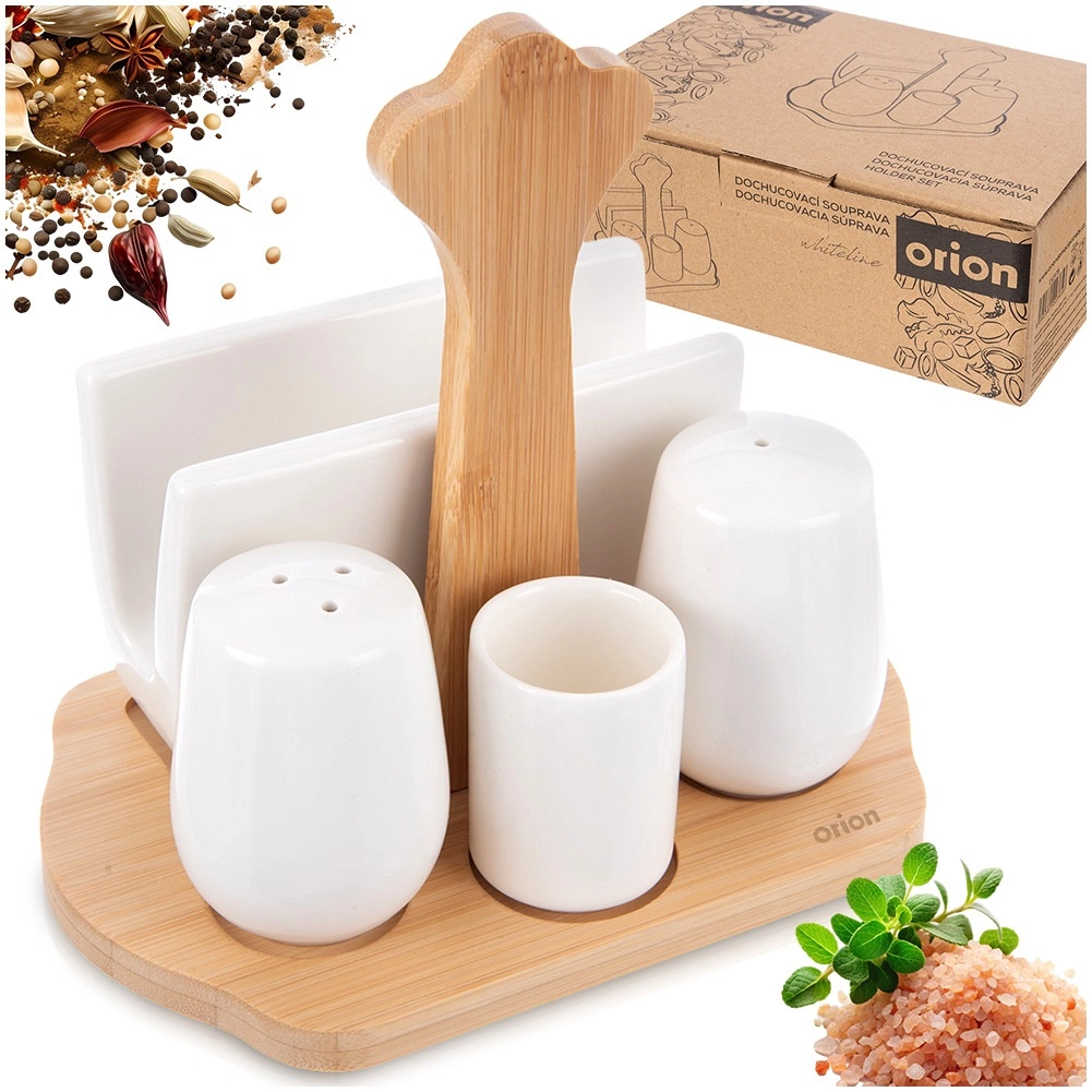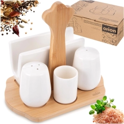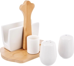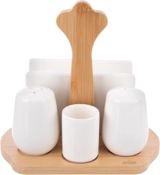 Elegantul set WHITELINE din 5 piese îmbină solnița și pipernița din porțelan, suportul pentru șervețele și paharul pentru scobitori pe o bază din bambus cu mâner, stilată. Ideal pentru mesele zilnice și ocazii festive, se curăță ușor și se potrivește perfect cu orice aranjament de masă.