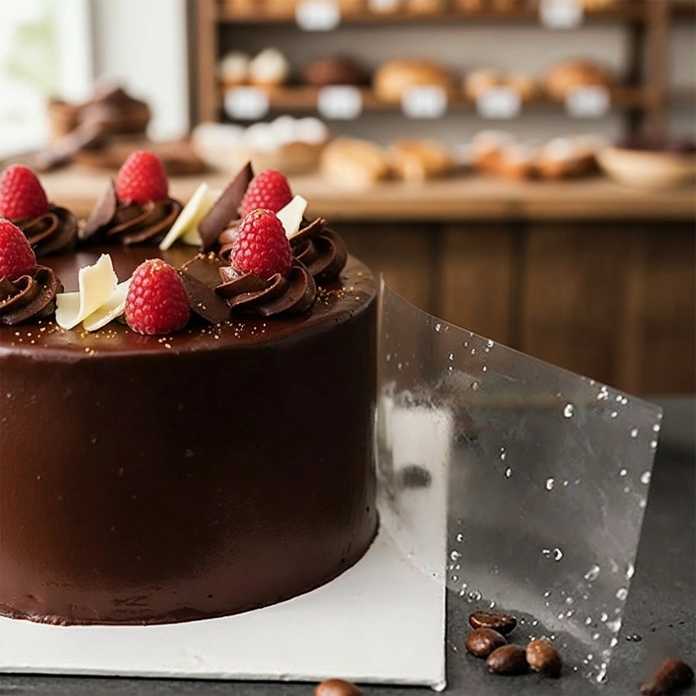 Folia este rezistentă, flexibilă și sigură pentru contactul cu alimentele, nu se lipește de creme și permite obținerea marginilor precise și drepte la aplicarea glazurilor și a glazurilor oglindă. Este excelentă și pentru modelarea decorațiunilor din ciocolată.