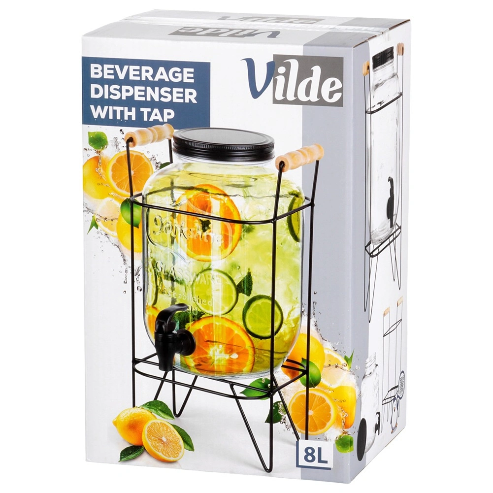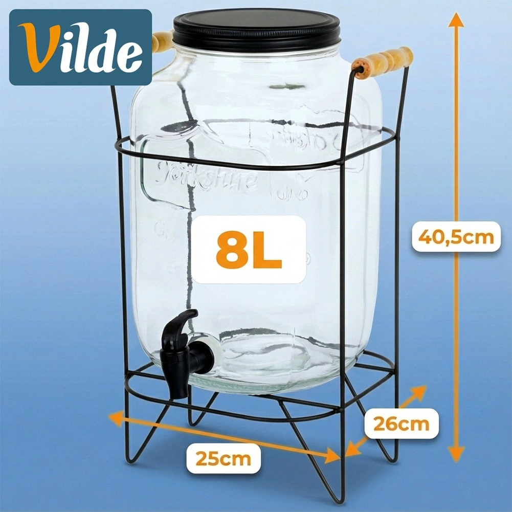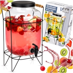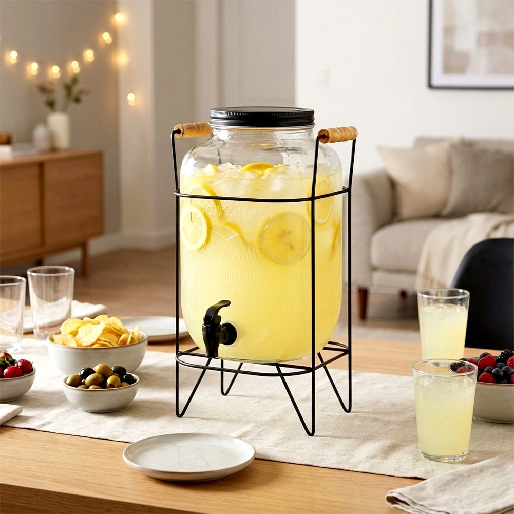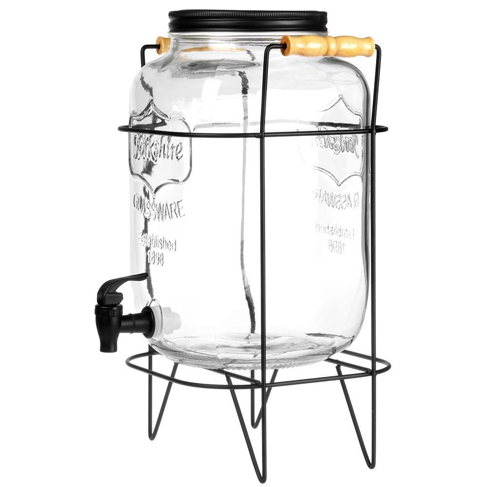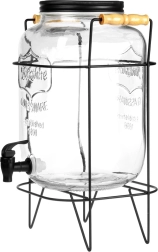 Elegant dispenser de băuturi din sticlă, 8 l, cu suport metalic stabil și robinet pentru turnare ușoară. Fabricat din sticlă groasă cu relief decorativ, are capac metalic cu filet și suport cu mânere din lemn. Ideal pentru limonadă, apă, ceai rece și punch, pentru petreceri în grădină sau acasă.