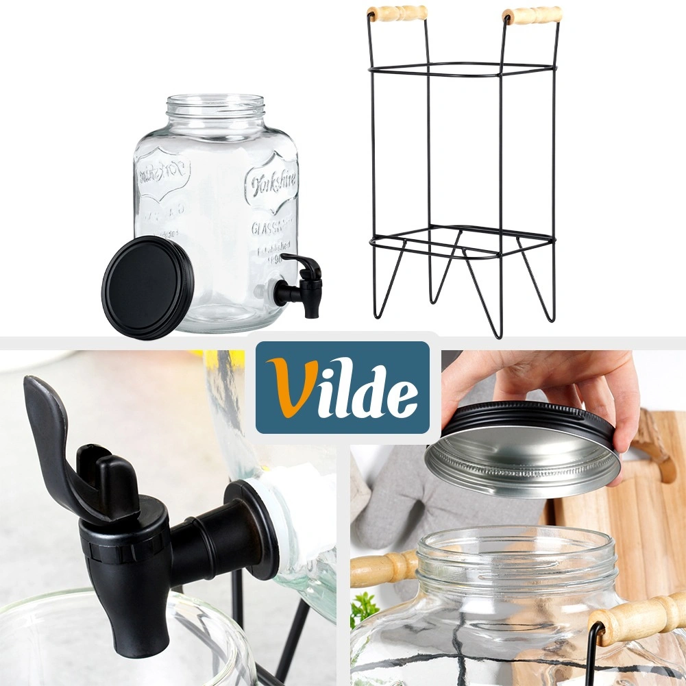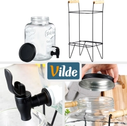 Recipientul din sticlă este fabricat din sticlă groasă de calitate, cu gravură decorativă. Suportul și capacul sunt din metal negru, mânerele din lemn, iar robinetul din plastic rezistent. Dispenserul este potrivit pentru apă cu fructe, limonade, ceai rece și băuturi cu cuburi de gheață. Nu este destinat băuturilor fierbinți.