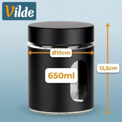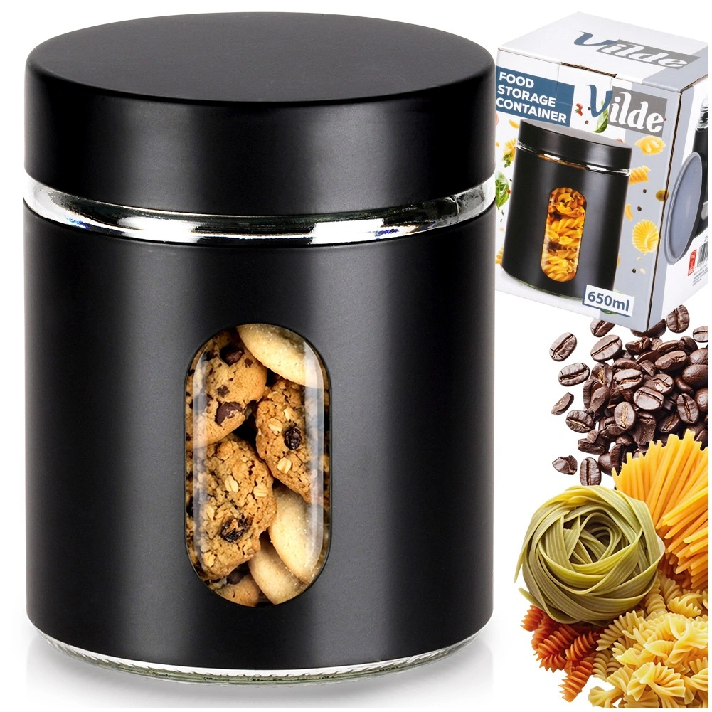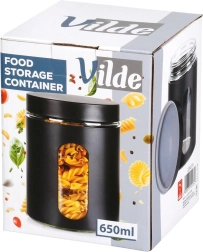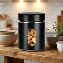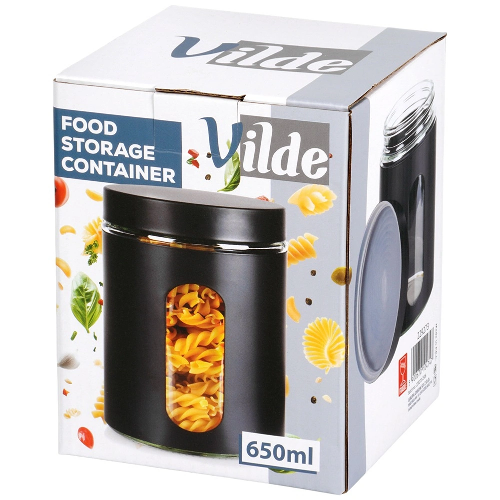 Borcan practic din sticlă, cu volum de 650 ml, capac înșurubabil și înveliș negru mat, ideal pentru depozitarea alimentelor vrac. Datorită ferestrei transparente aveți mereu vizibilitate asupra conținutului, iar etanșarea ermetică protejează alimentele de umiditate și mirosuri. Designul modern se potrivește perfect în orice bucătărie și ajută la menținerea ordinii și prospețimii alimentelor.