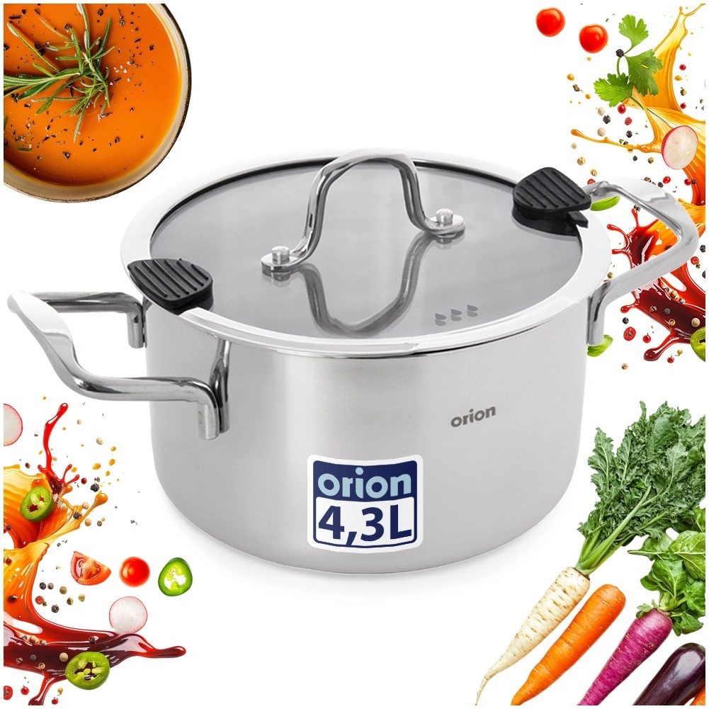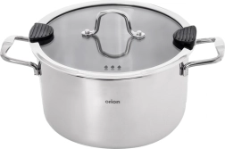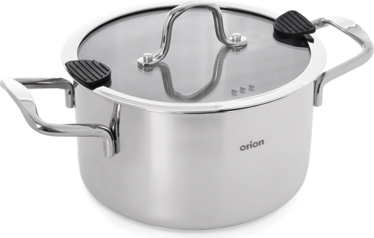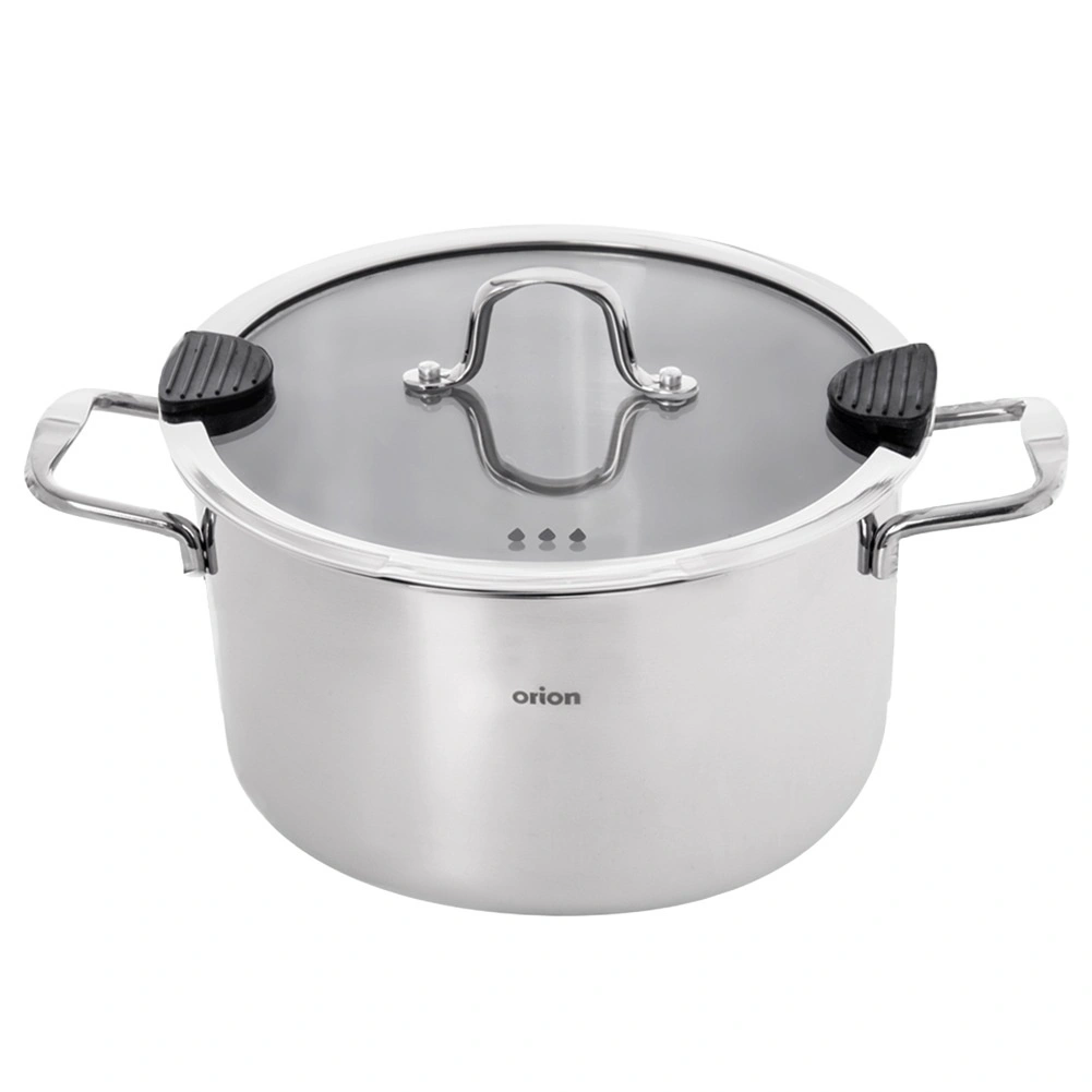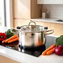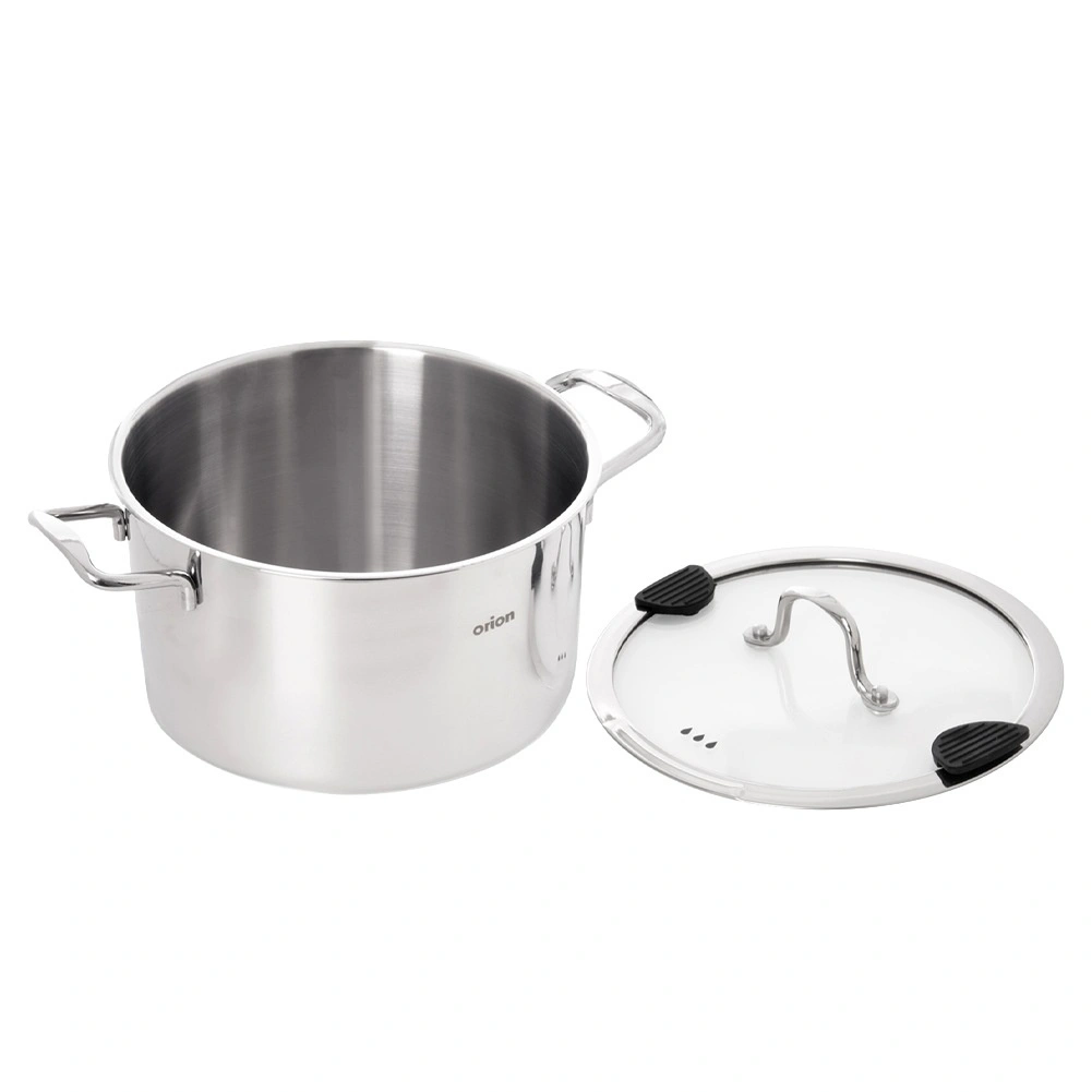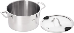 Oală practică și durabilă din oțel inoxidabil 304 lustruit cu capac din sticlă, ideală pentru supe, gulașuri, mâncăruri la oală unică și fripturi. Datorită bazei multistrat cu miez de aluminiu, distribuie căldura uniform și accelerează gătirea. Capacul din sticlă cu gură de scurgere integrată și mânere din silicon permite scurgerea sigură a apei fără strecurătoare.