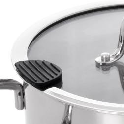 Gurile de scurgere integrate și mânerele din silicon de pe marginea capacului permit scurgerea sigură a apei și evacuarea aburului fără a folosi strecurătoare.