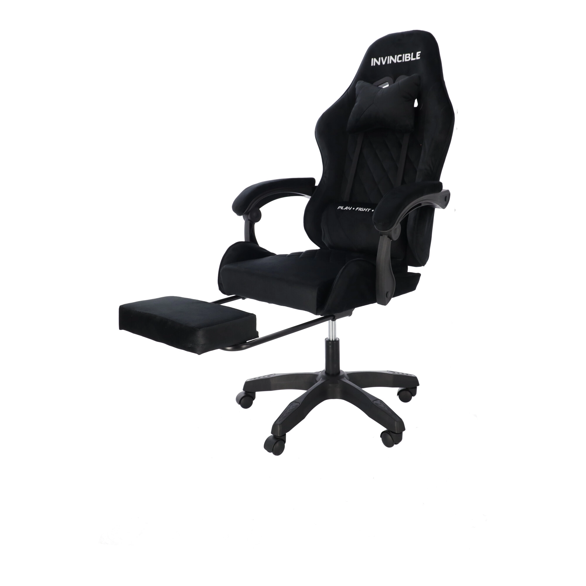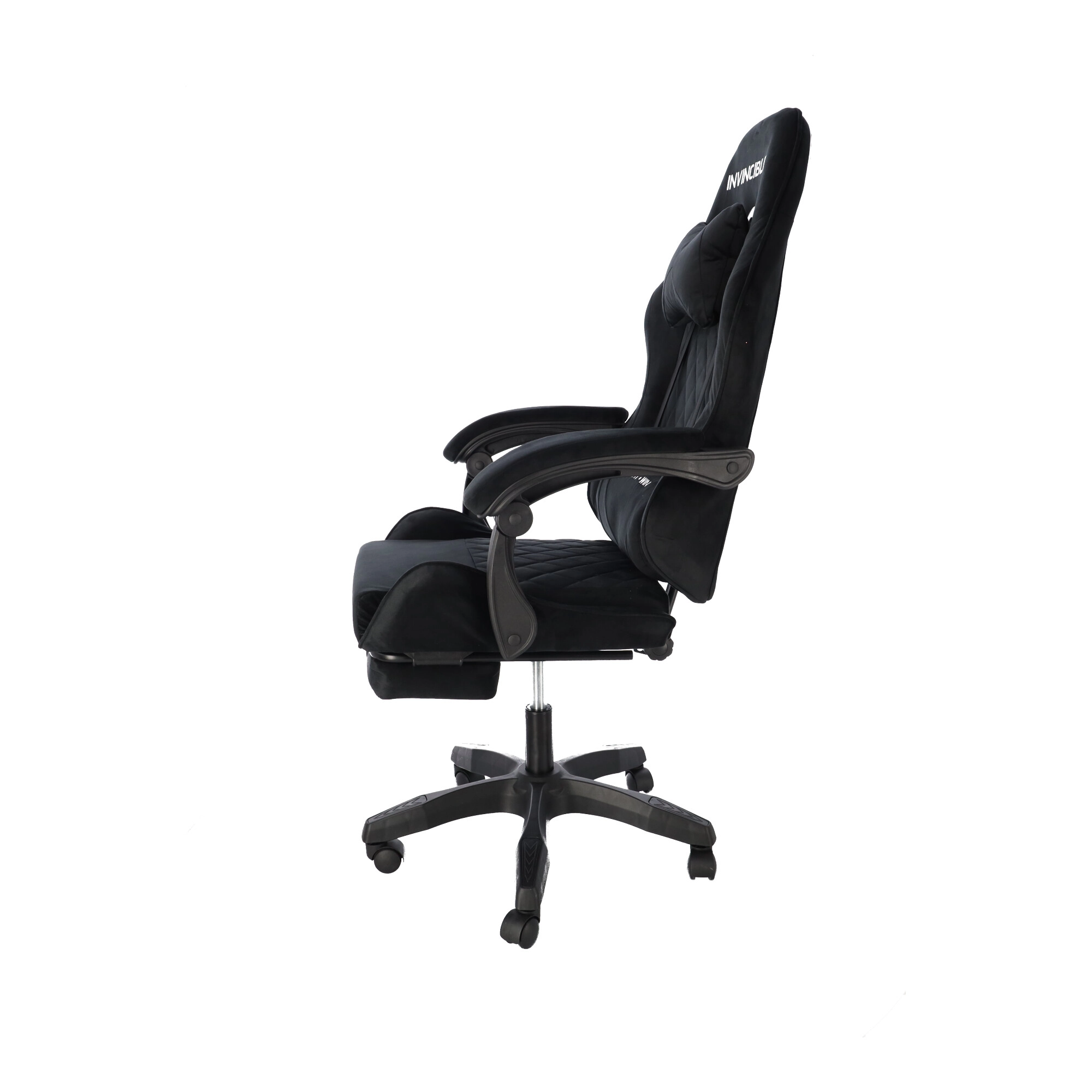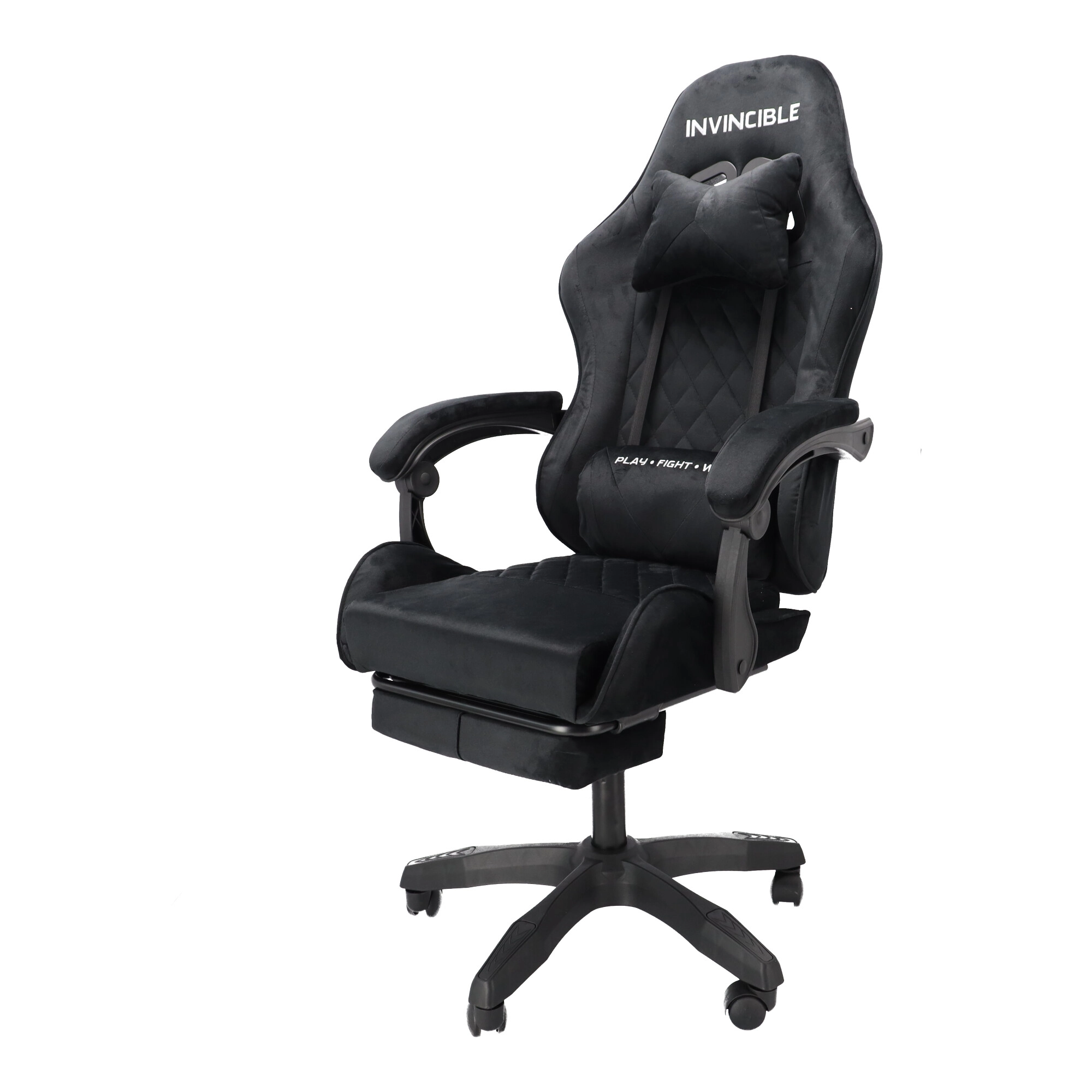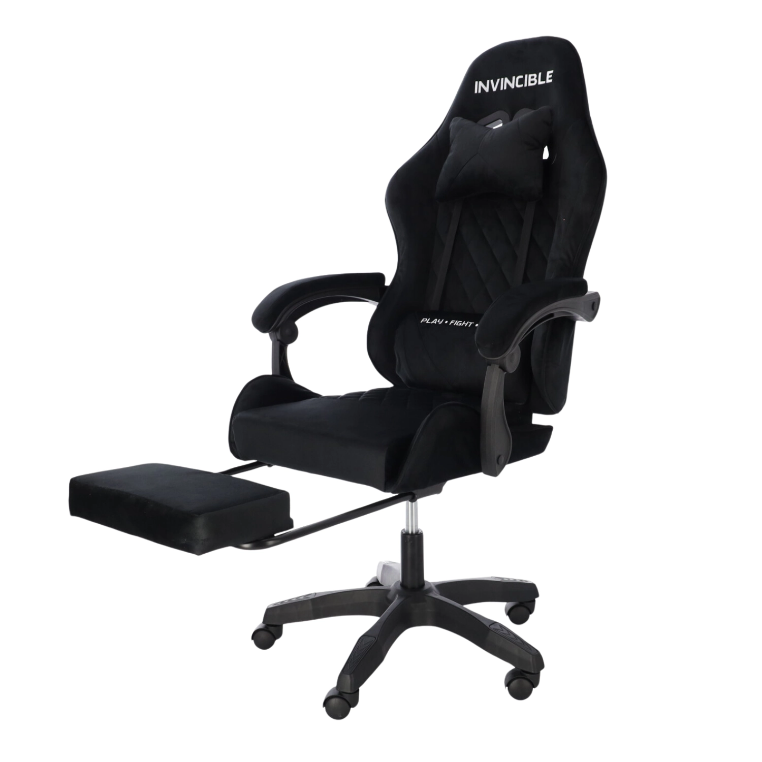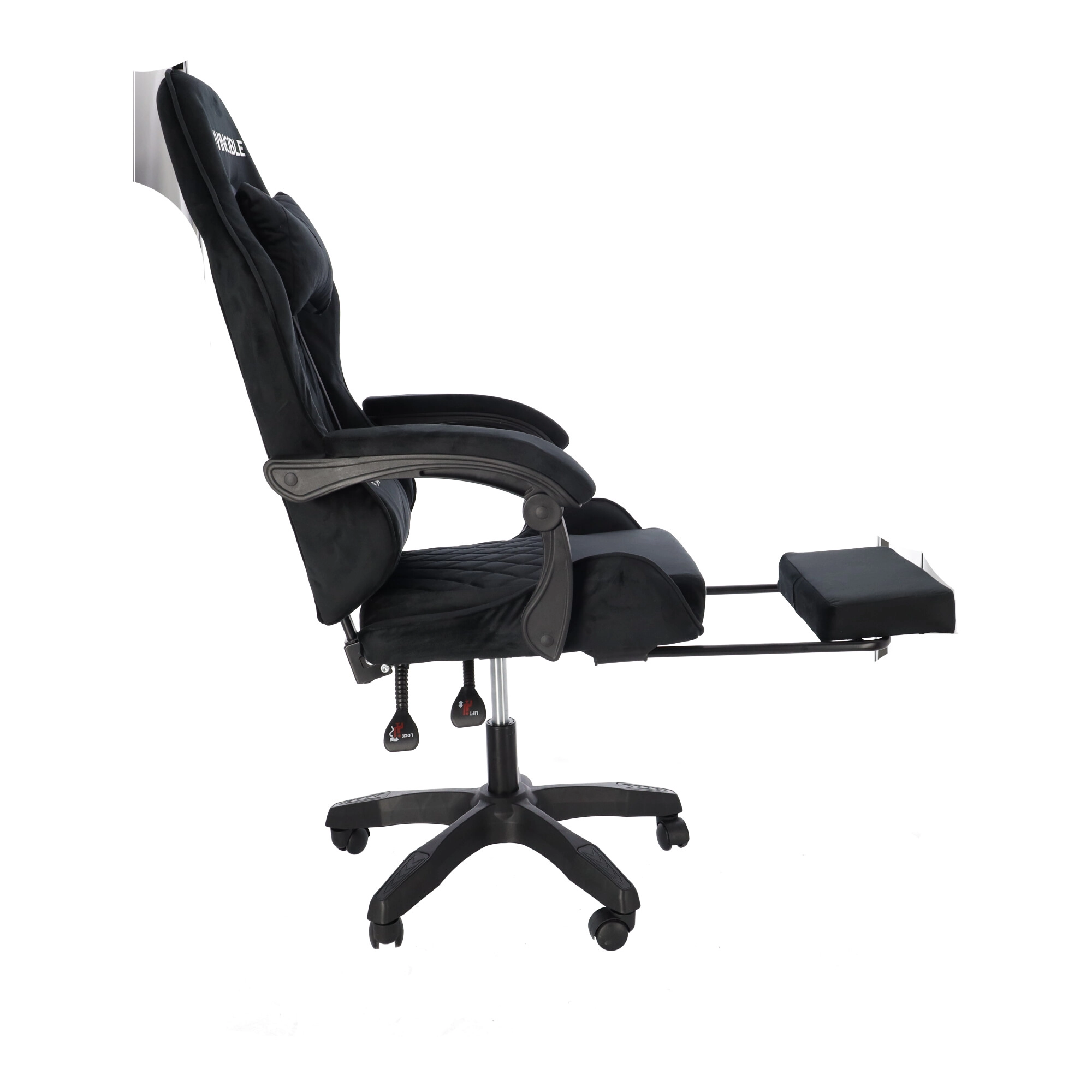 Scaun de gaming stilat, tapițat cu catifea neagră, combină confortul cu un aspect elegant. Spătarul ergonomic, perna pentru gât și suportul lombar susțin postura corectă a corpului. Datorită reglării pe înălțime, înclinării până la 145°, rotației la 360° și suportului pentru picioare extensibil îți găsești ușor poziția ideală pentru gaming, lucru și relaxare. Baza stabilă în cinci brațe cu roți asigură deplasare lină și capacitate de încărcare de 130 kg.