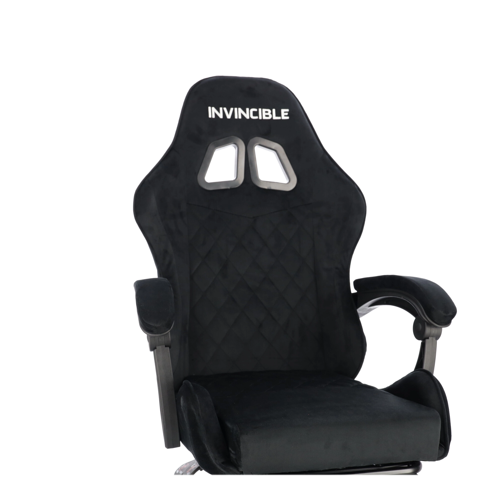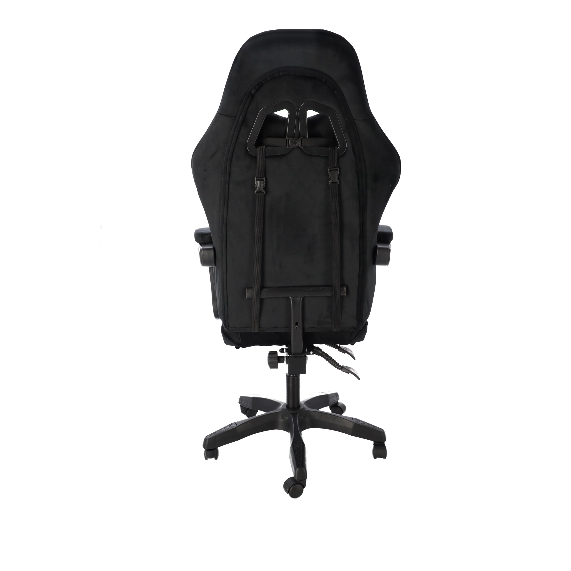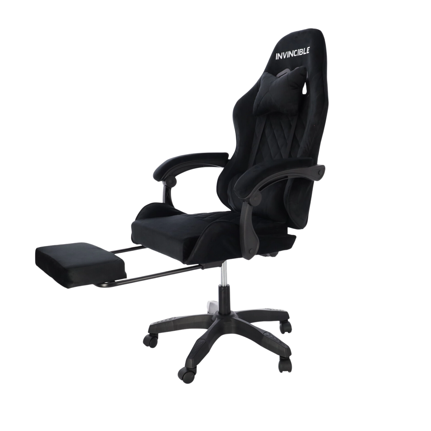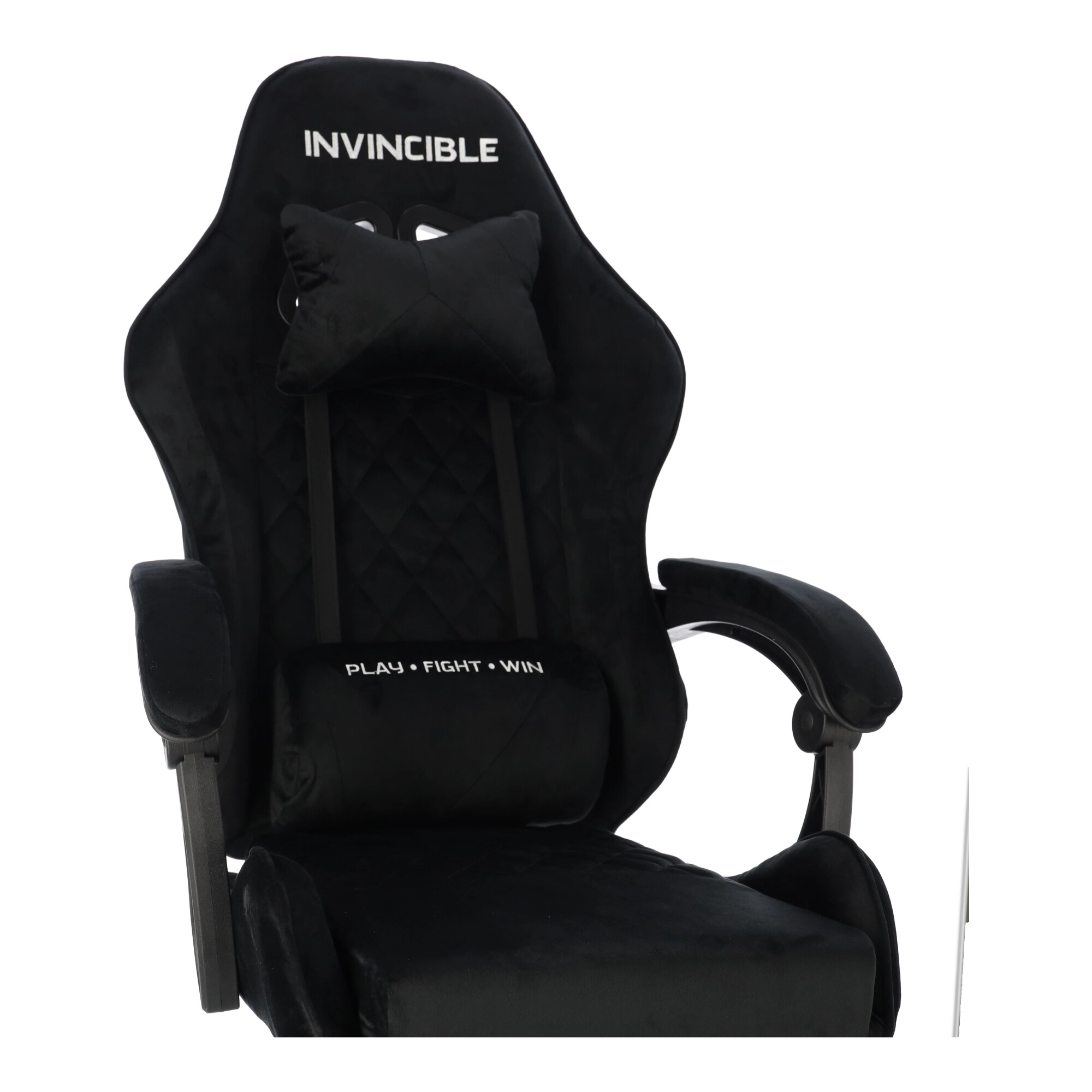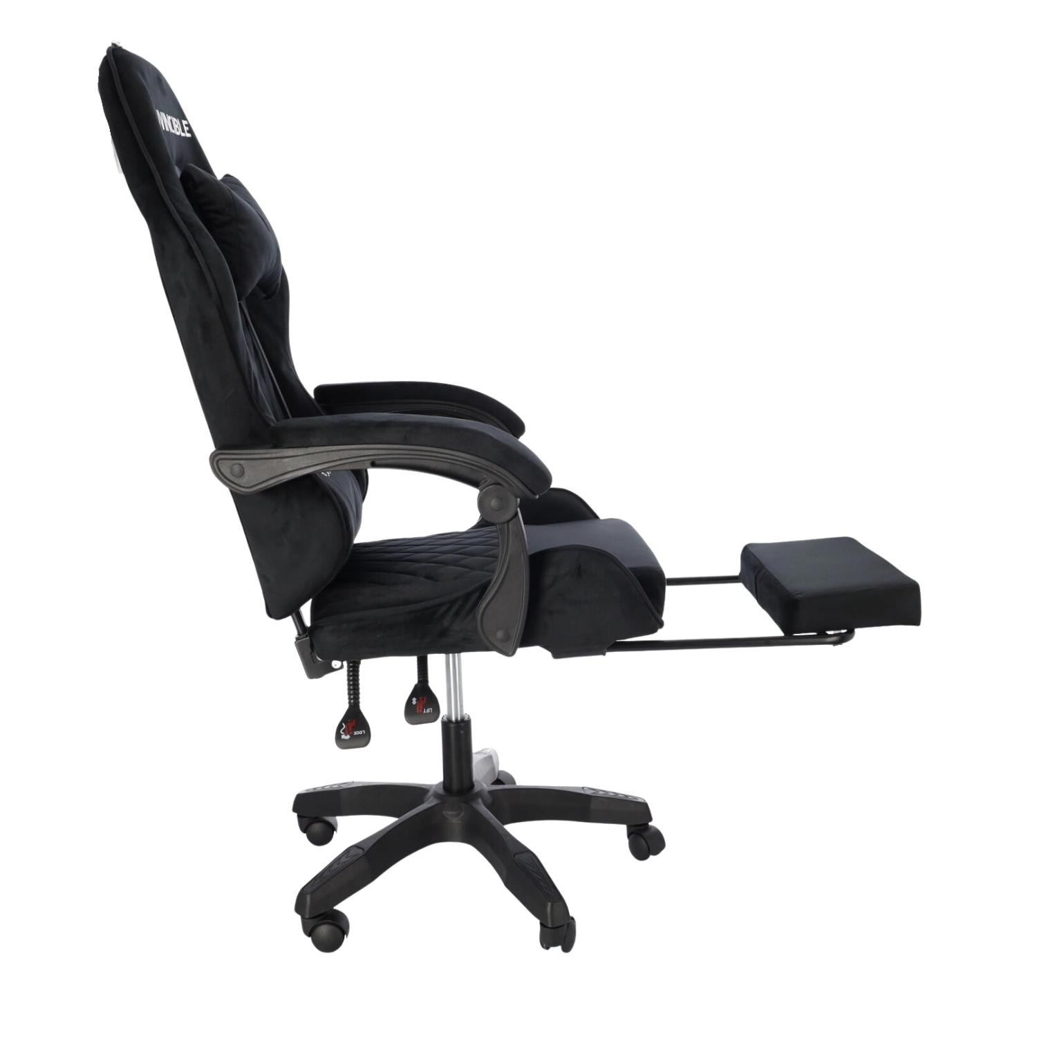 Scaun de gaming stilat, tapițat cu catifea neagră, combină confortul cu un aspect elegant. Spătarul ergonomic, perna pentru gât și suportul lombar susțin postura corectă a corpului. Datorită reglării pe înălțime, înclinării până la 145°, rotației la 360° și suportului pentru picioare extensibil îți găsești ușor poziția ideală pentru gaming, lucru și relaxare. Baza stabilă în cinci brațe cu roți asigură deplasare lină și capacitate de încărcare de 130 kg.